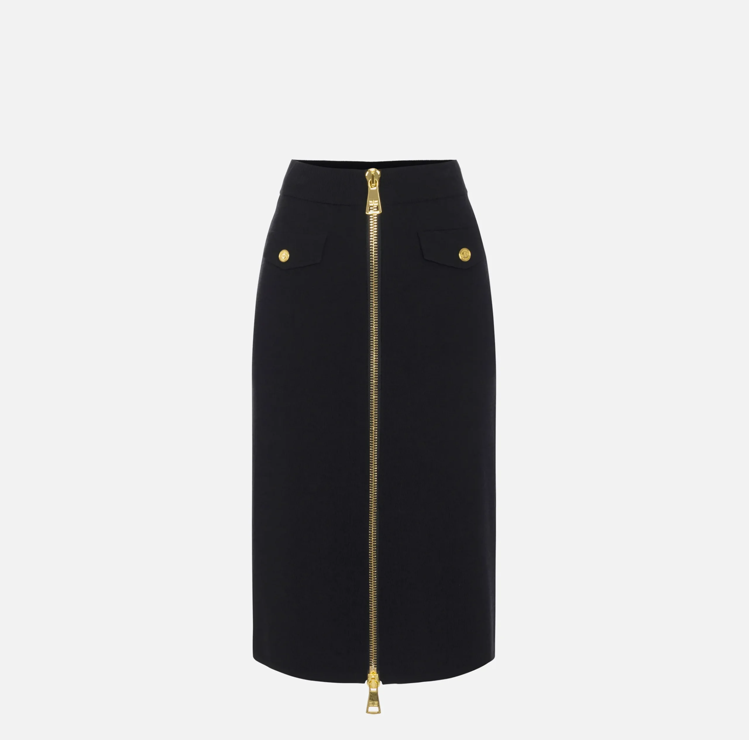 Gonna midi in viscosa svasata al fondo con tasche a patta rifinite da bottoni. È caratterizzata da maxi zip in metallo dorato.