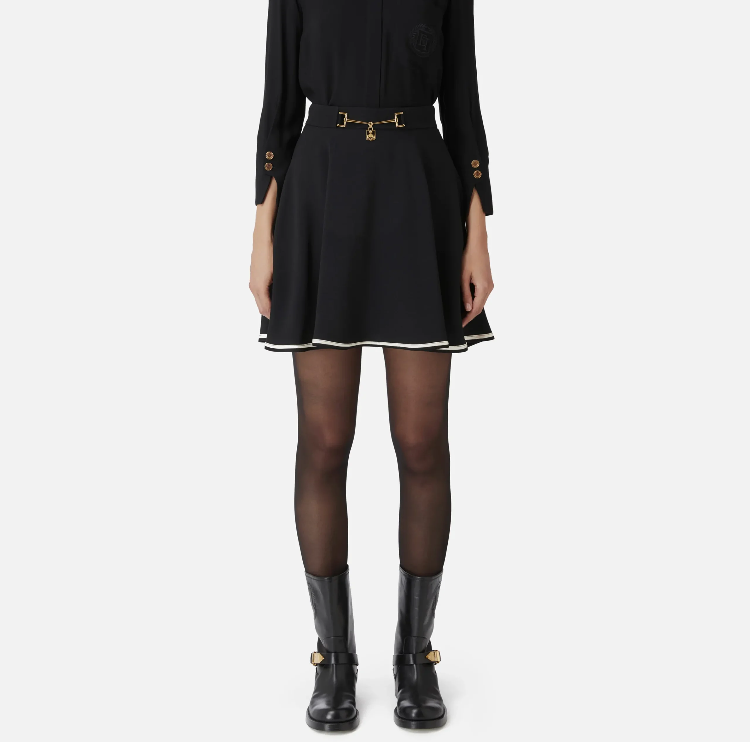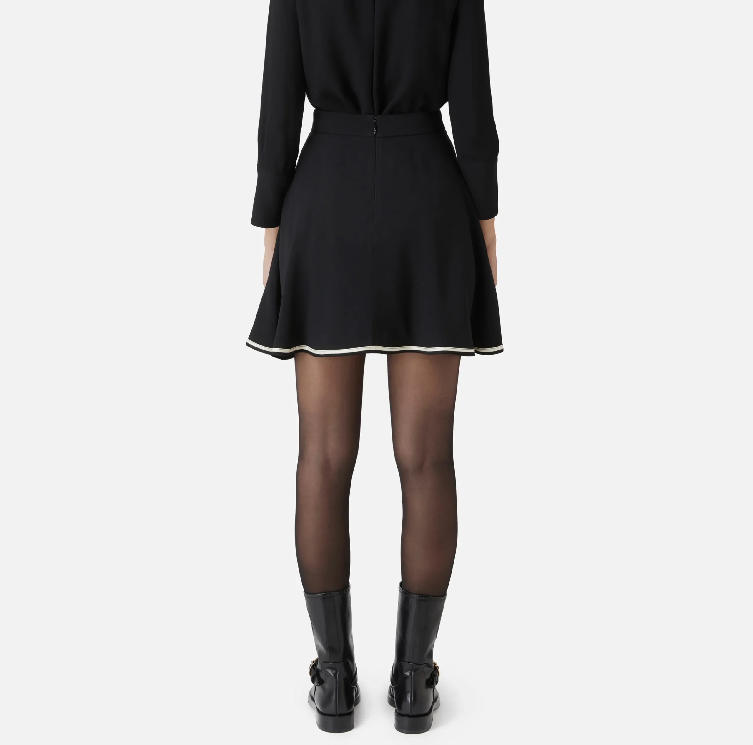 Minigonna a ruota in crêpe fluido con bordo al fondo in contrasto colore. Personalizza il capo un morsetto in metallo dorato posizionato sul fascione in vita.