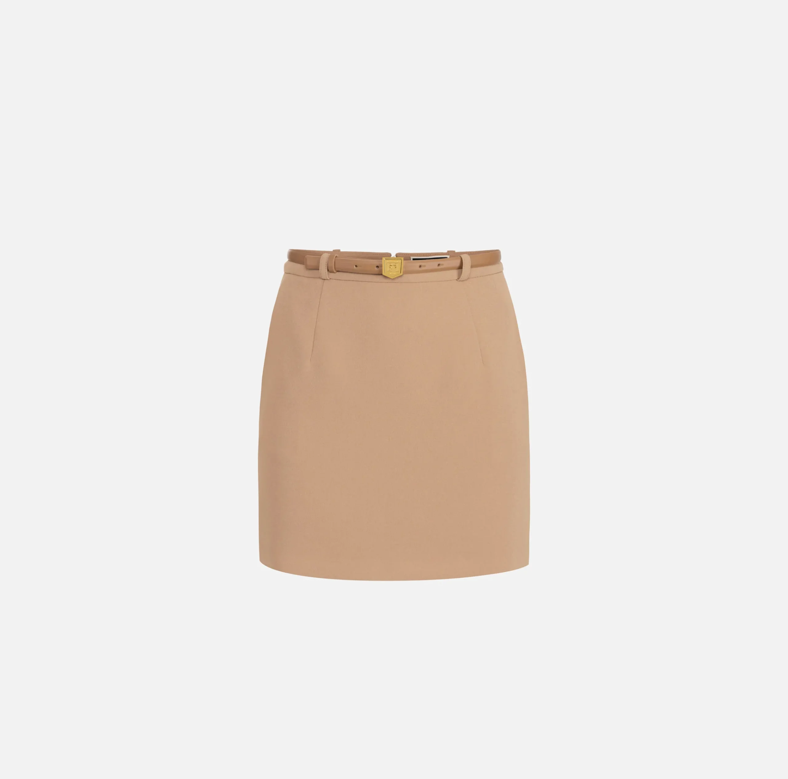 Minigonna in crêpe fermo con tasche alla francese sul fianco e a patta dietro rifinite da ricamo logo a filo in tono. Il punto vita è enfatizzato da cintura con fibbia logo in metallo dorato.