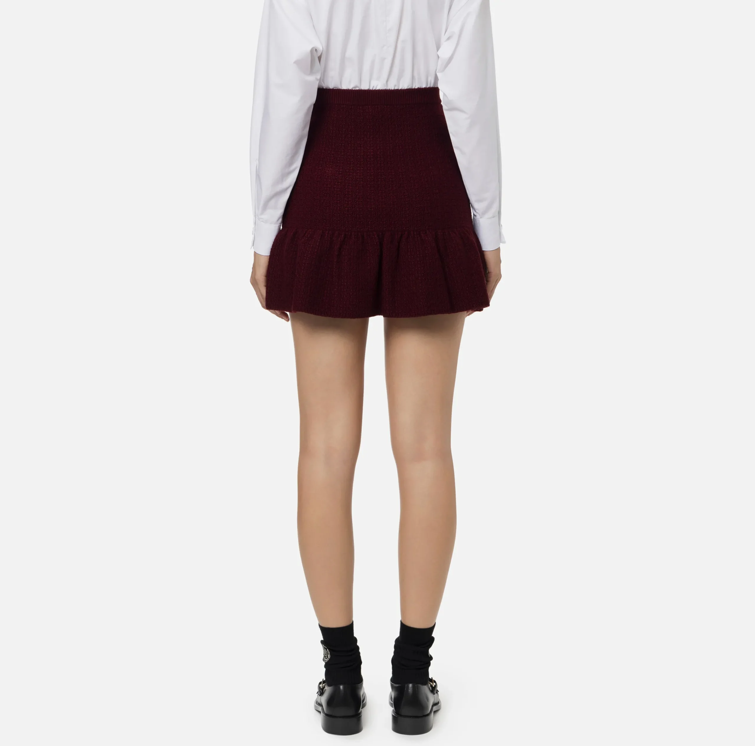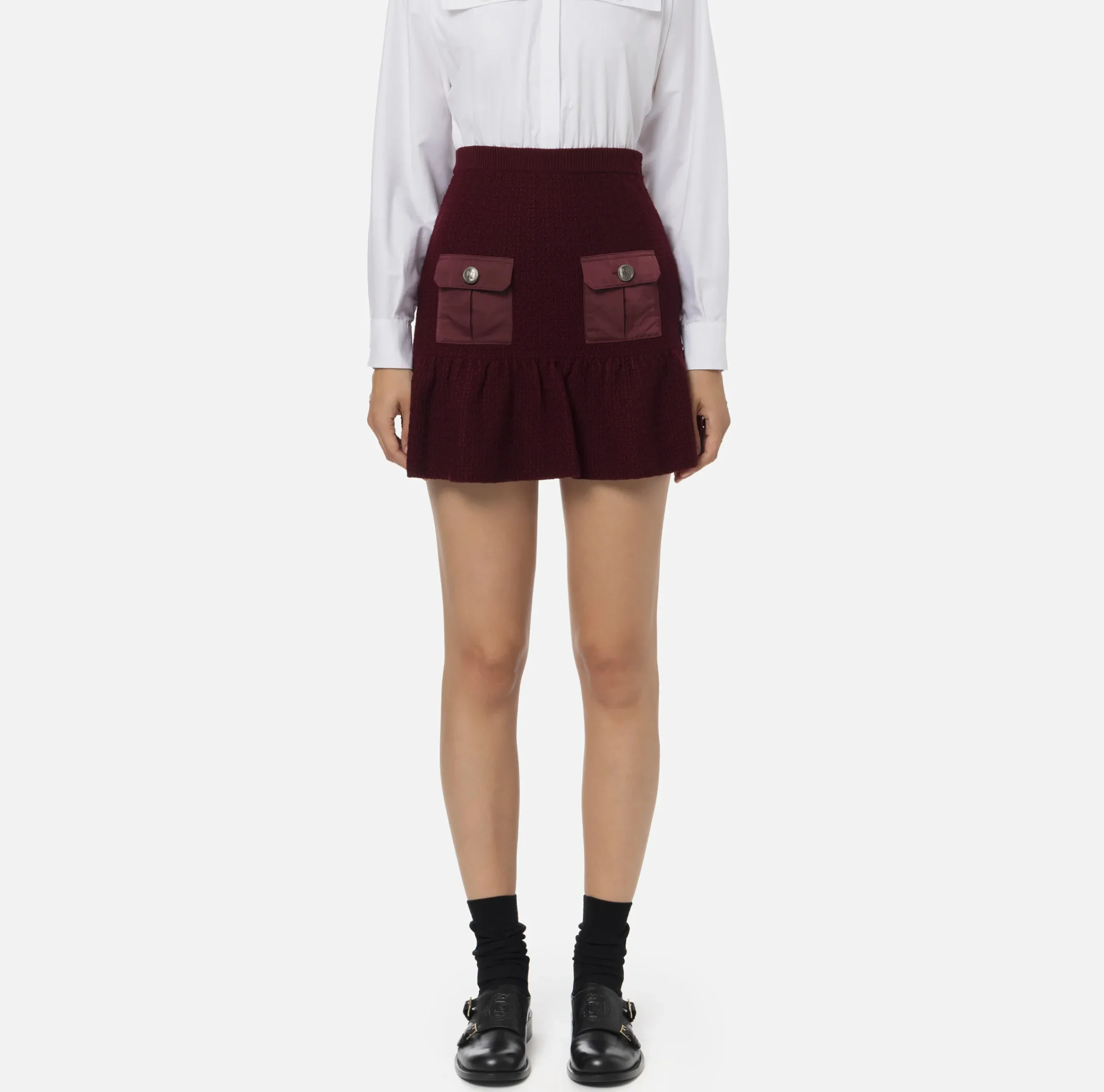 Minigonna in misto lana bouclé con balza al fondo. È caratterizzata da tasche a soffietto in vela tecnica rifinite da patte e bottoni logati in metallo silver.
