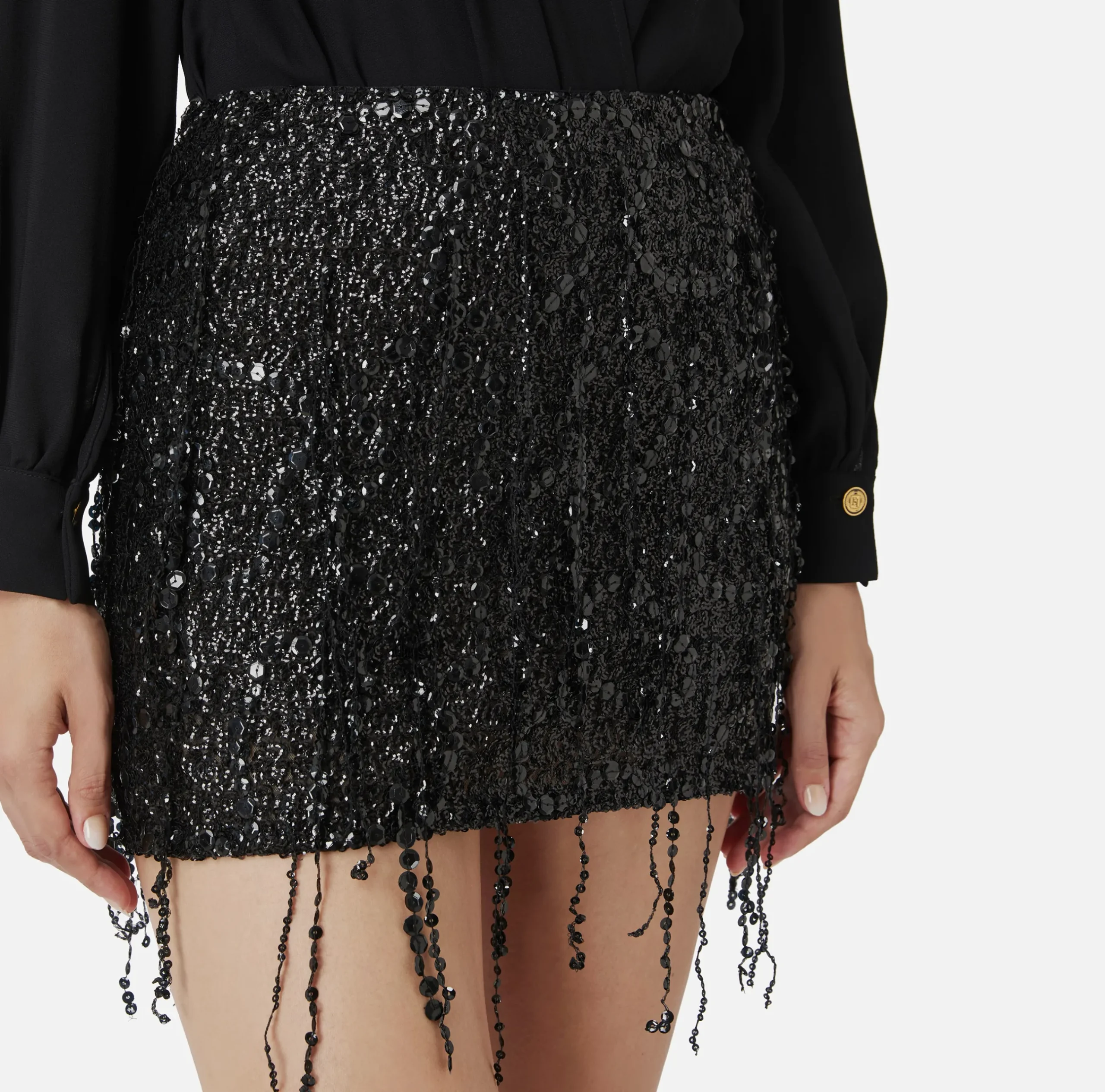 Gonne|Elisabetta Franchi Minigonna in tulle ricamata con frange di paillettes Nero