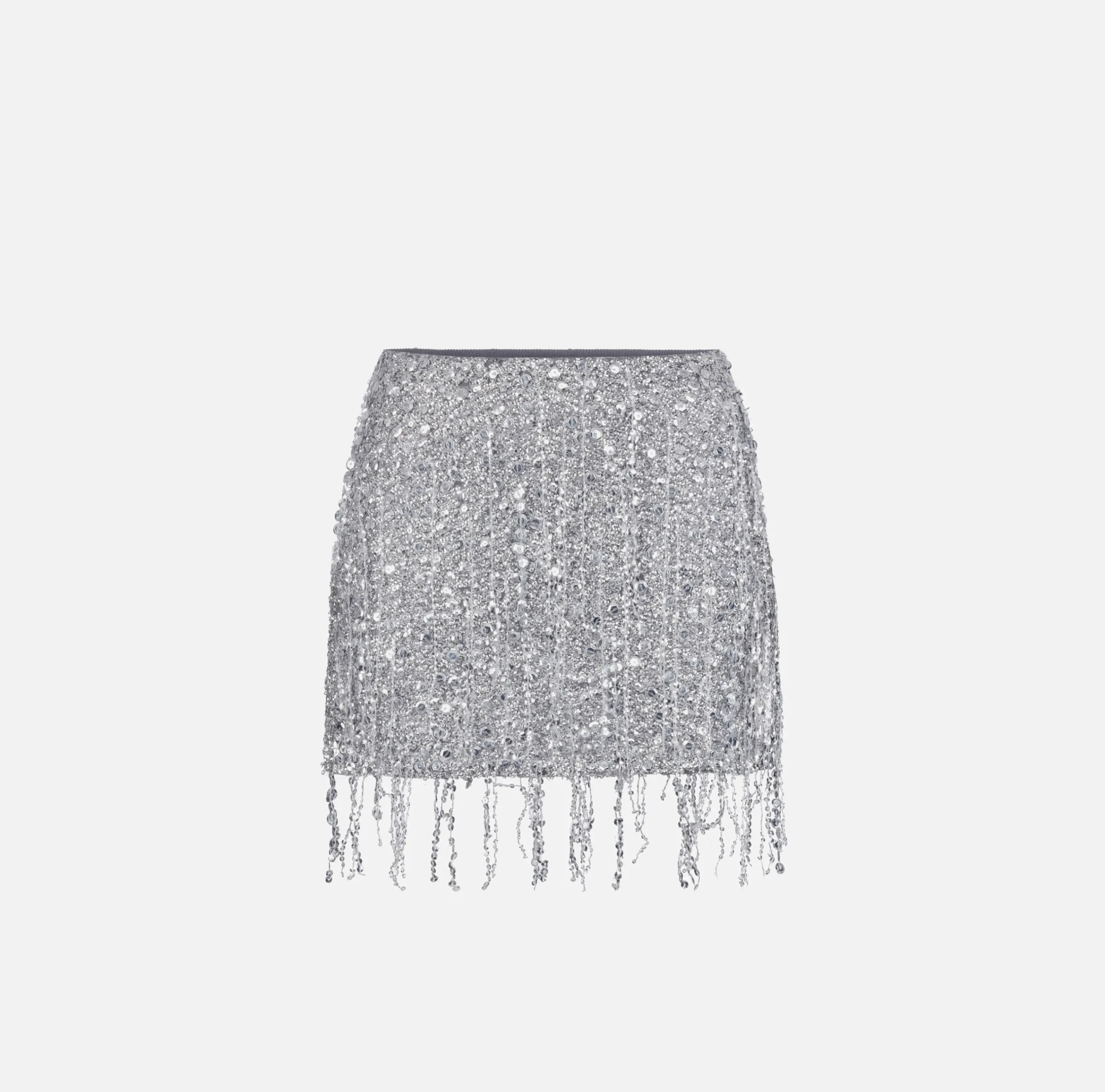 Minigonna a vita bassa interamente ricamato con frange di paillettes. Personalizza il capo l’etichetta jacquard logata cucita sul retro.