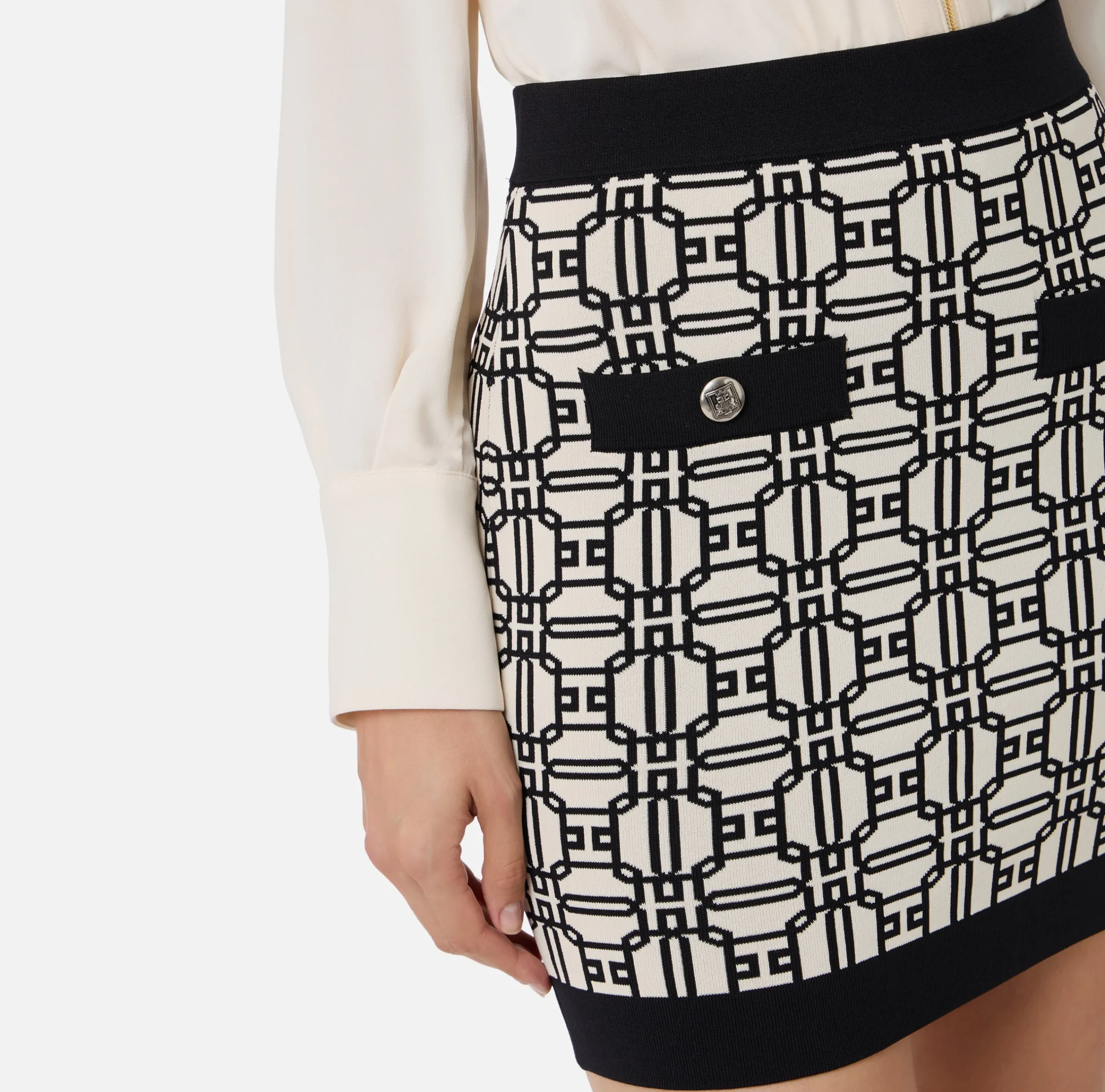 Gonne|Elisabetta Franchi Minigonna in viscosa jacquard con logo Burro/Nero