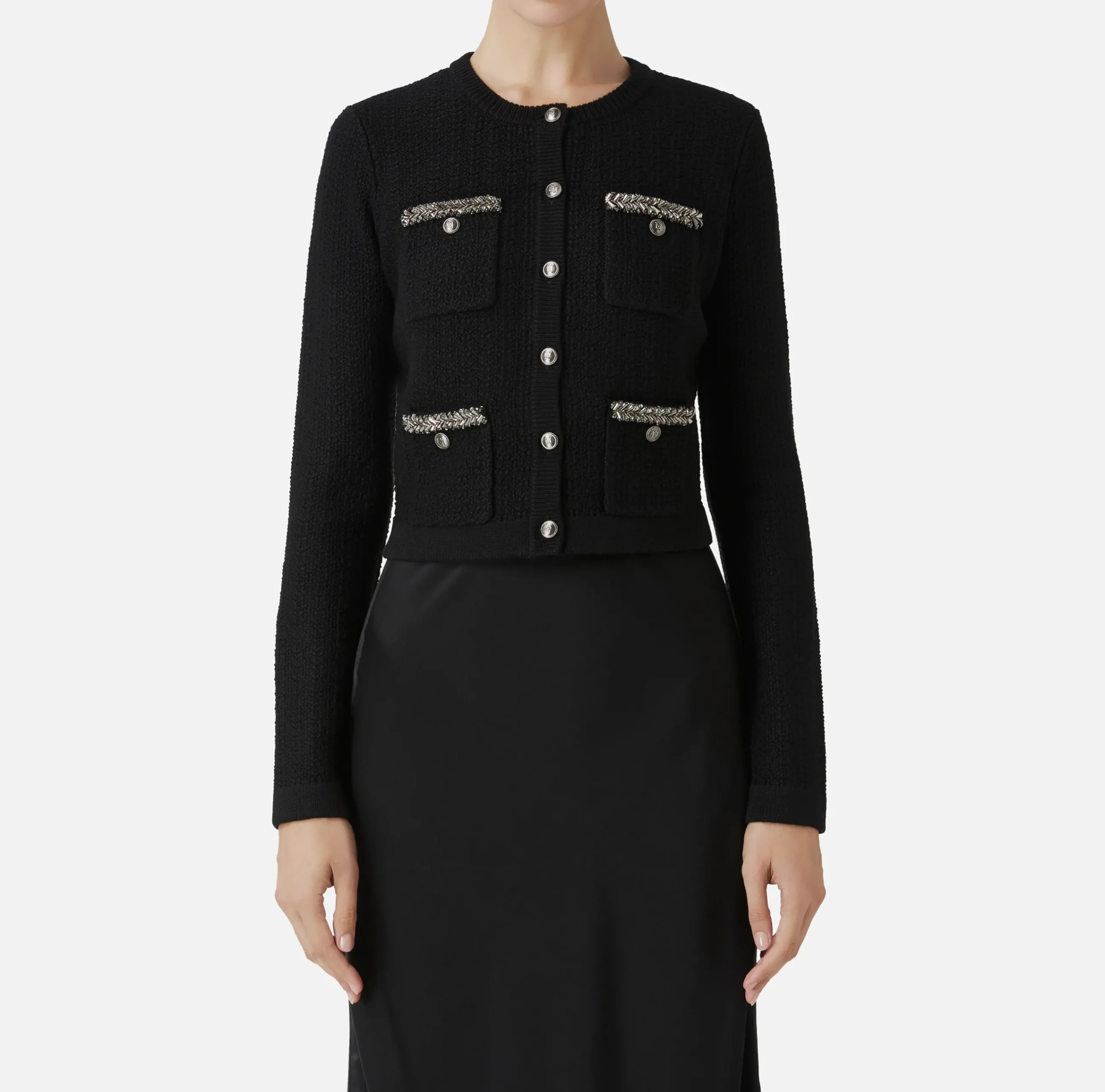 Cardigan in misto lana bouclé a maniche lunghe con scollo a giro. È caratterizzato da tasche a toppa rifinite da un ricamo di perline, canottiglie e bottoni logati in metallo silver.