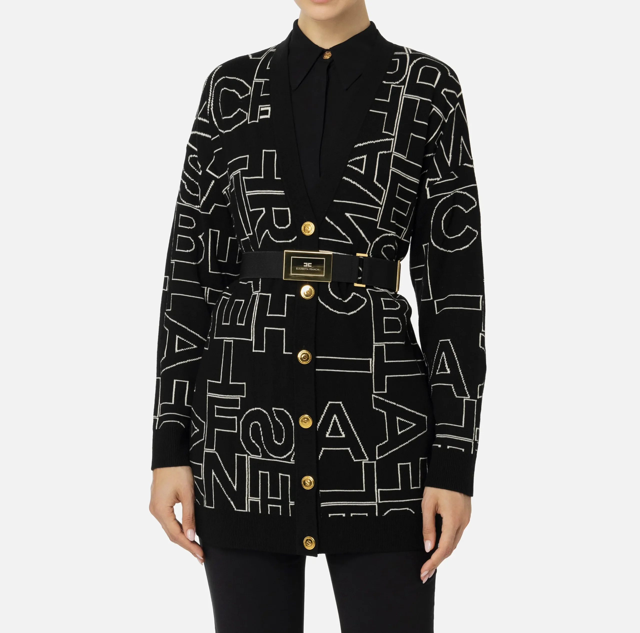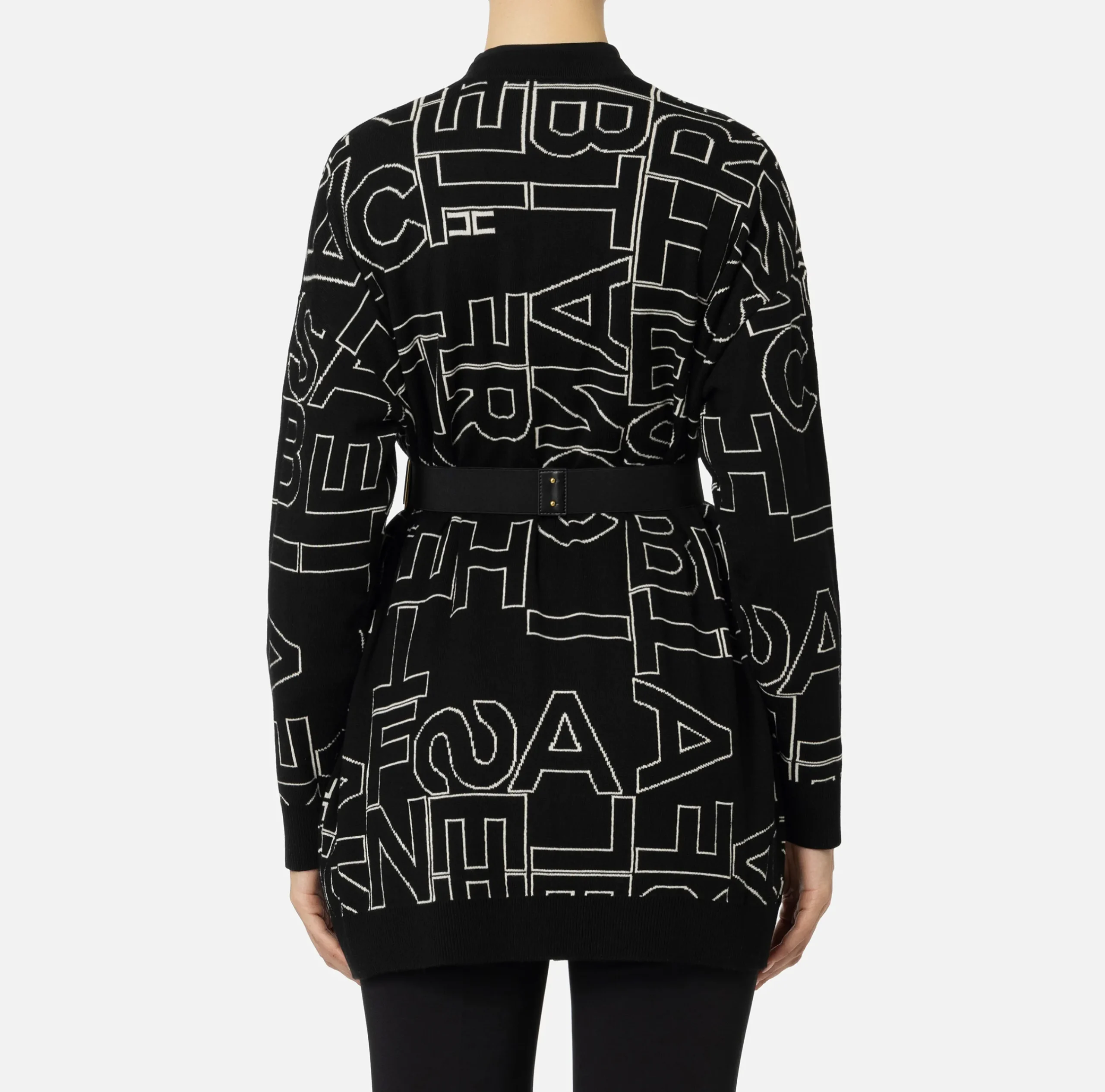 Cardigan in misto lana lettering all over a maniche lunghe. È caratterizzato da spalle scese e cintura in elastico con placca logo in metallo dorato.