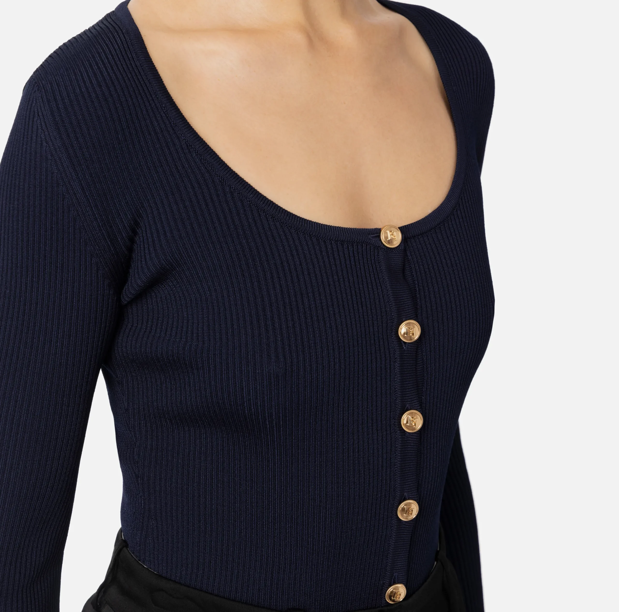 Cardigan in misto viscosa con scollo a madonna e bottoni logati in metallo dorato. Personalizza il capo l’etichetta jacquard logata cucita sul fondo.