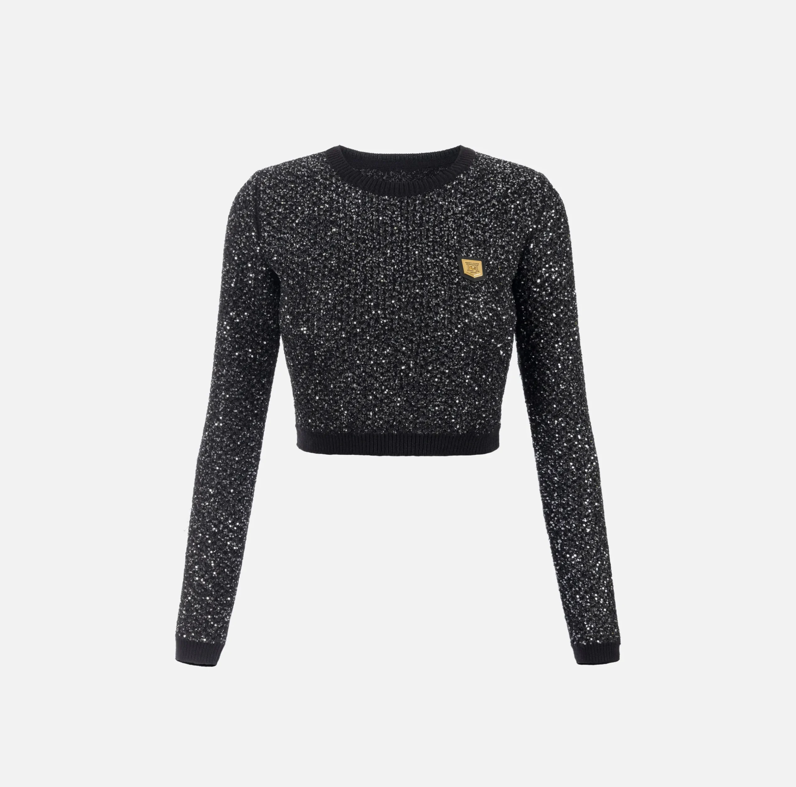 Top cropped in misto lana con filo paillettes a maniche lunghe. È caratterizzato da fascione in elastico logato lucido e placca logo in metallo dorato sul petto.