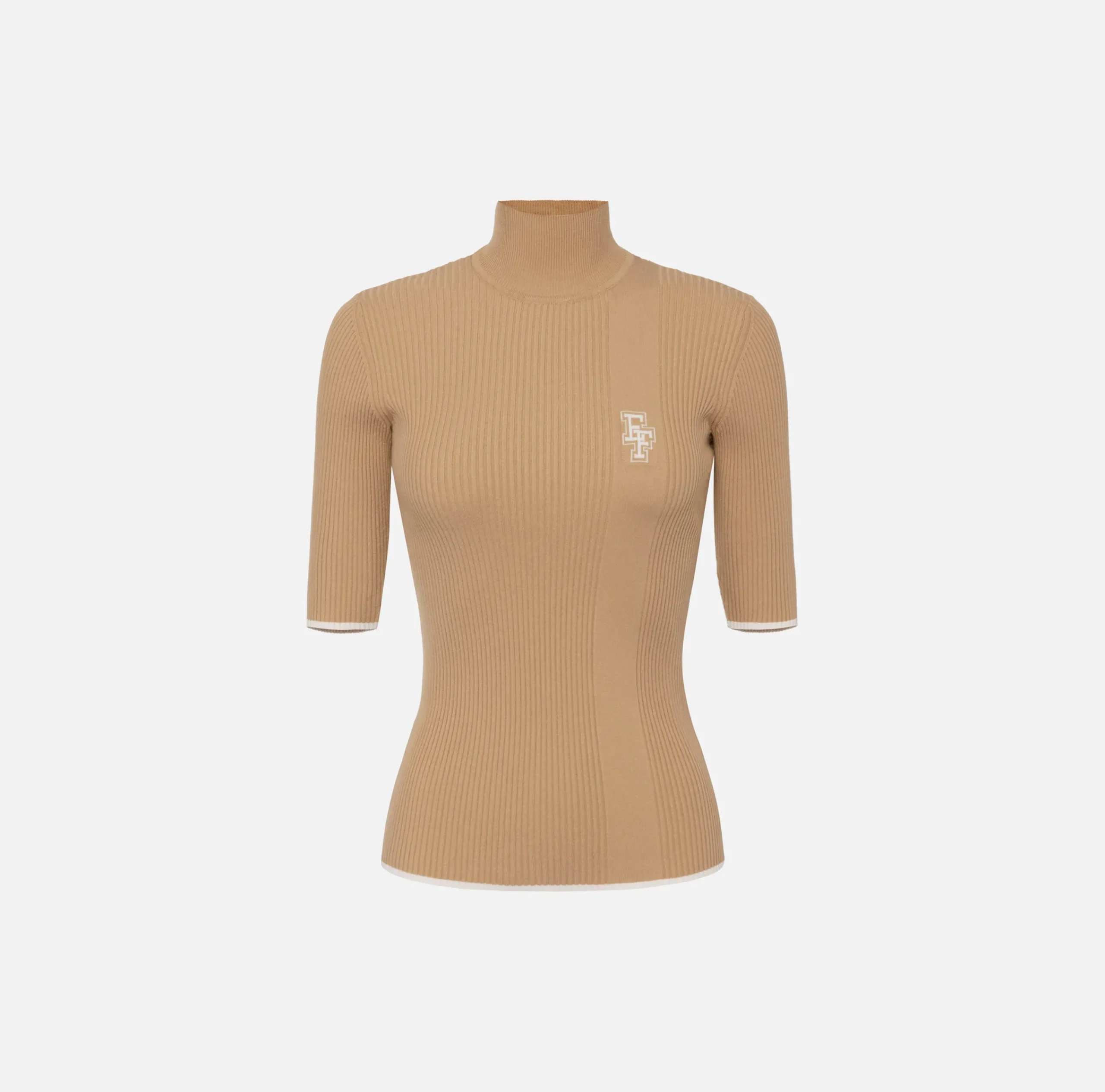 Dolcevita in misto viscosa a costine a maniche corte. È caratterizzata da profili e logo intarsiato in contrasto colore.
