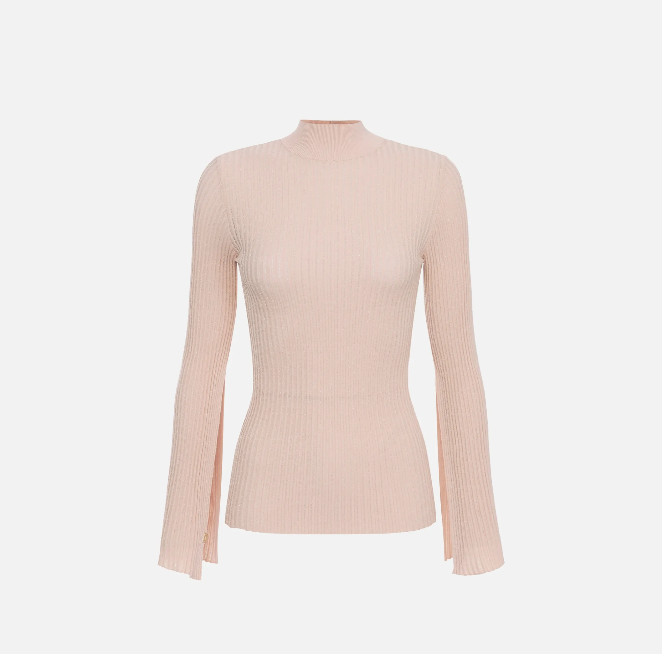 Dolcevita in viscosa lurex a costine con collo alto. È caratterizzata da placca logo in metallo dorato sulla manica.