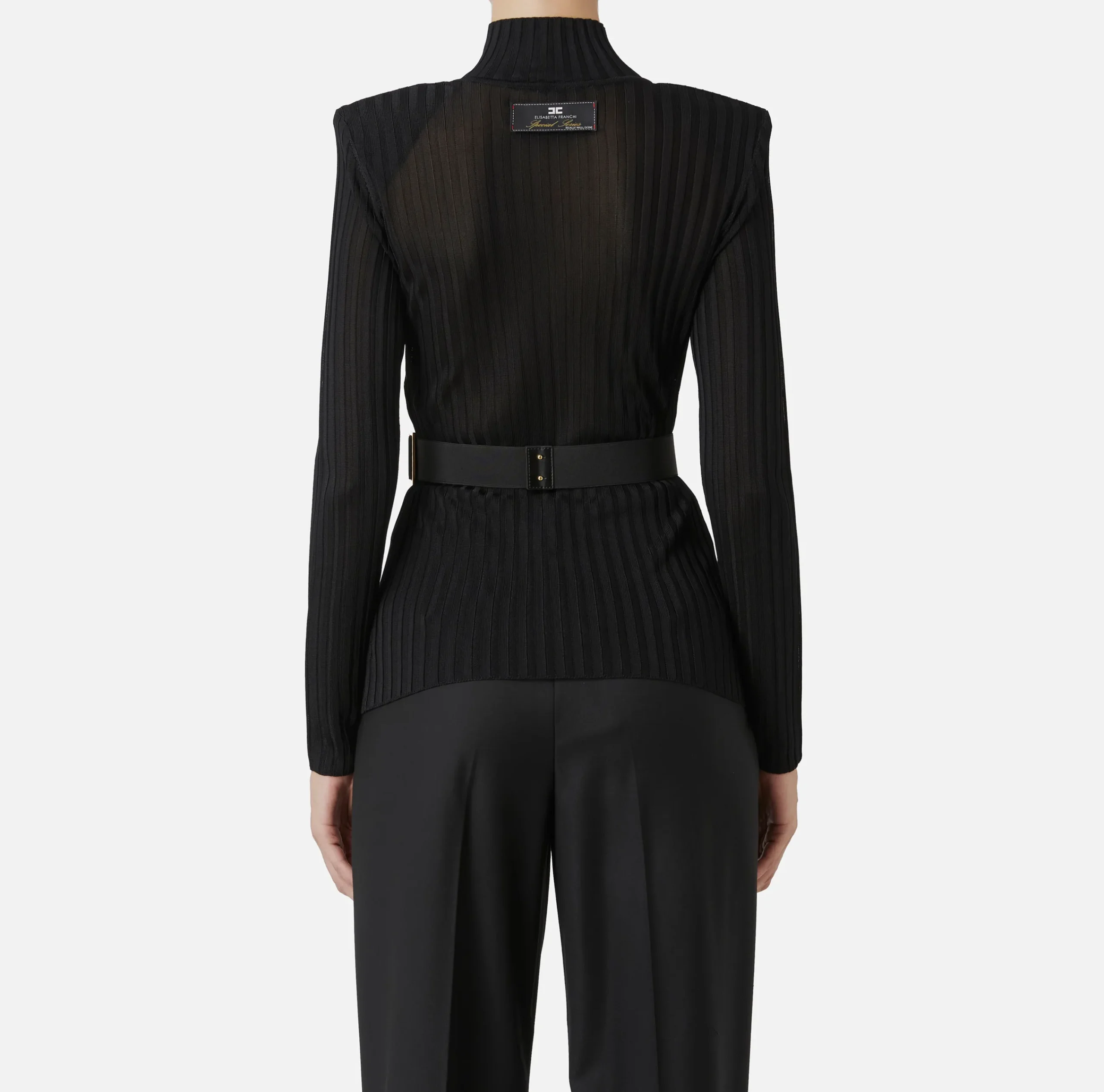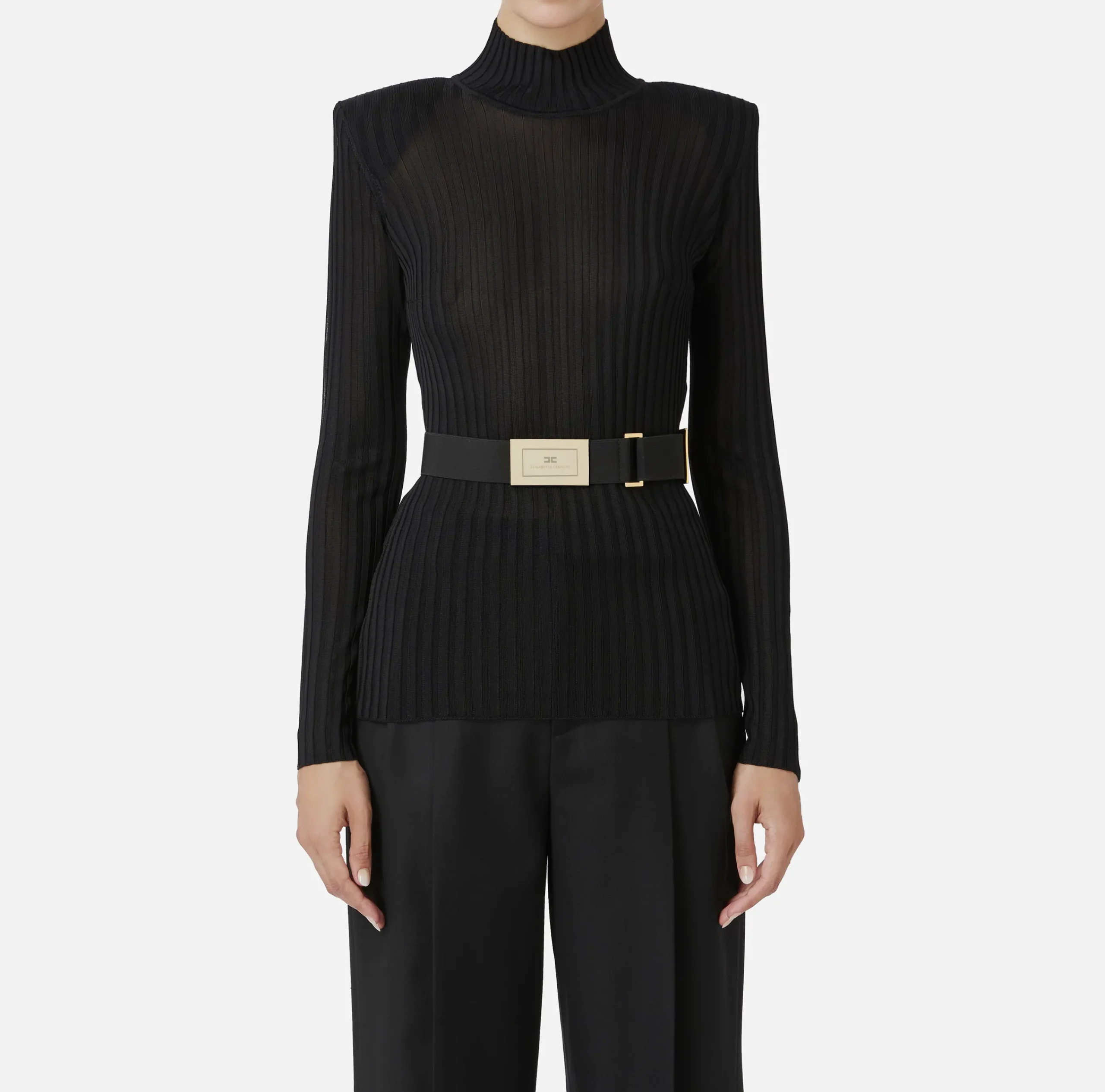 Maglieria E Felpe|Elisabetta Franchi Dolcevita in viscosa lucida a costine con cintura Nero