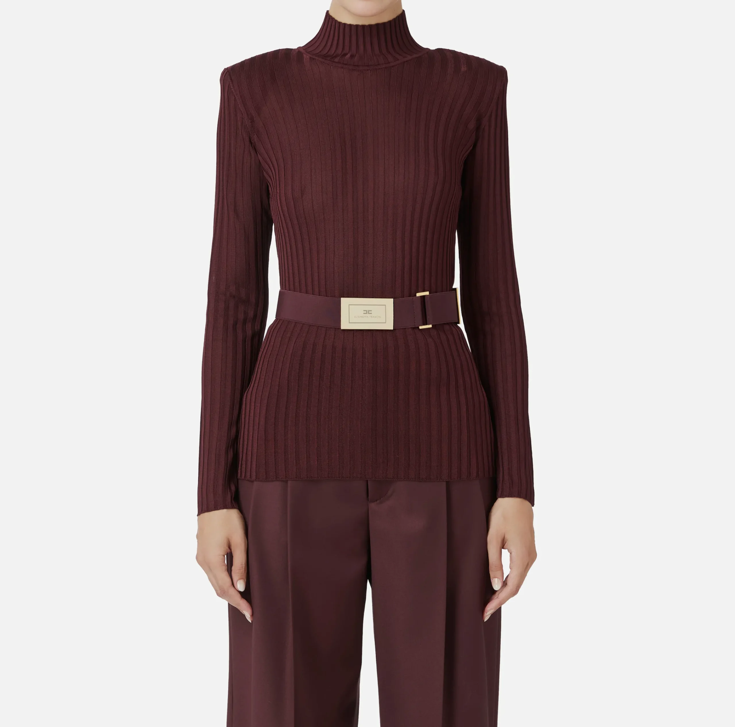 Maglieria E Felpe|Elisabetta Franchi Dolcevita in viscosa lucida a costine con cintura RougeNoir