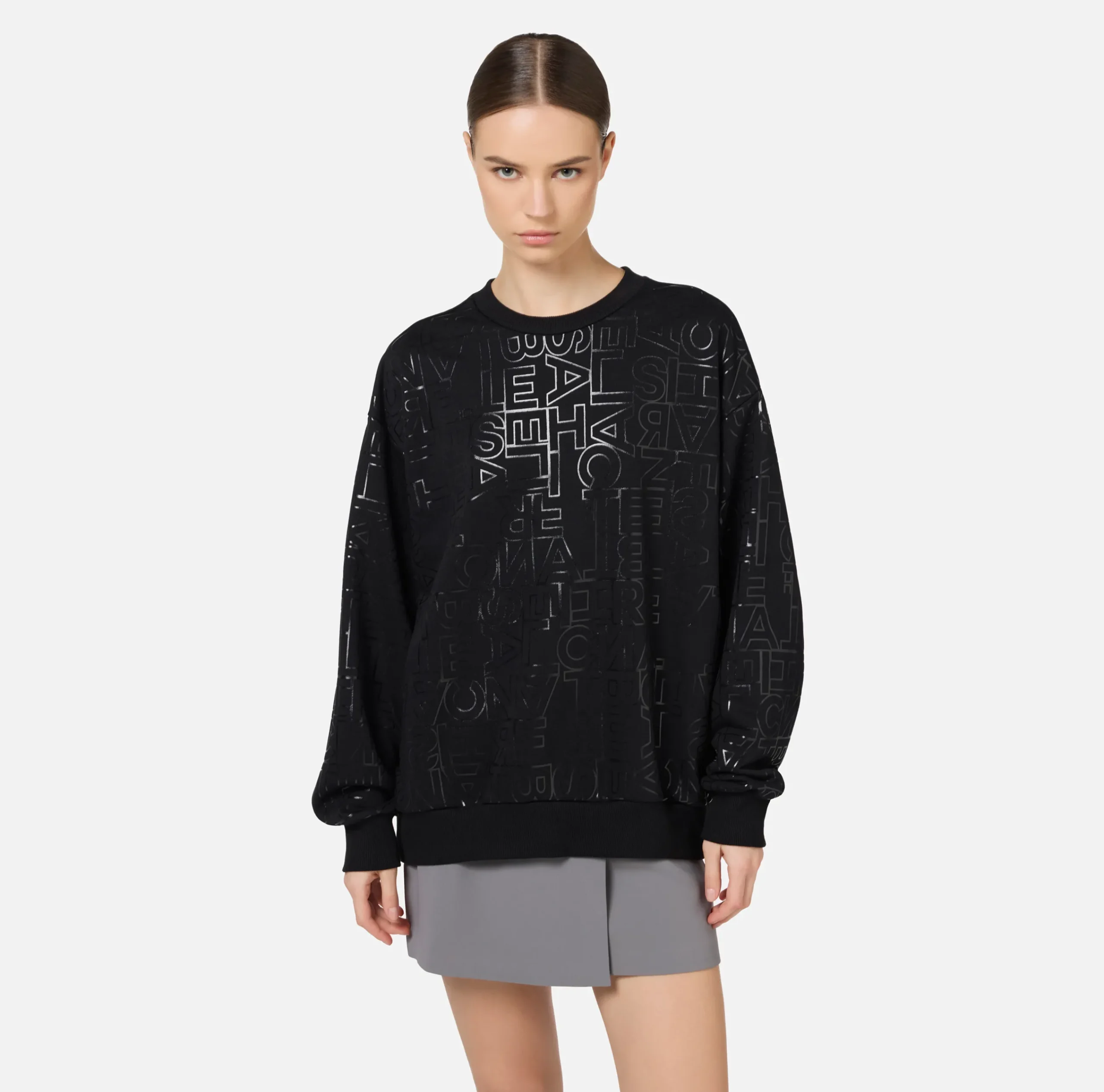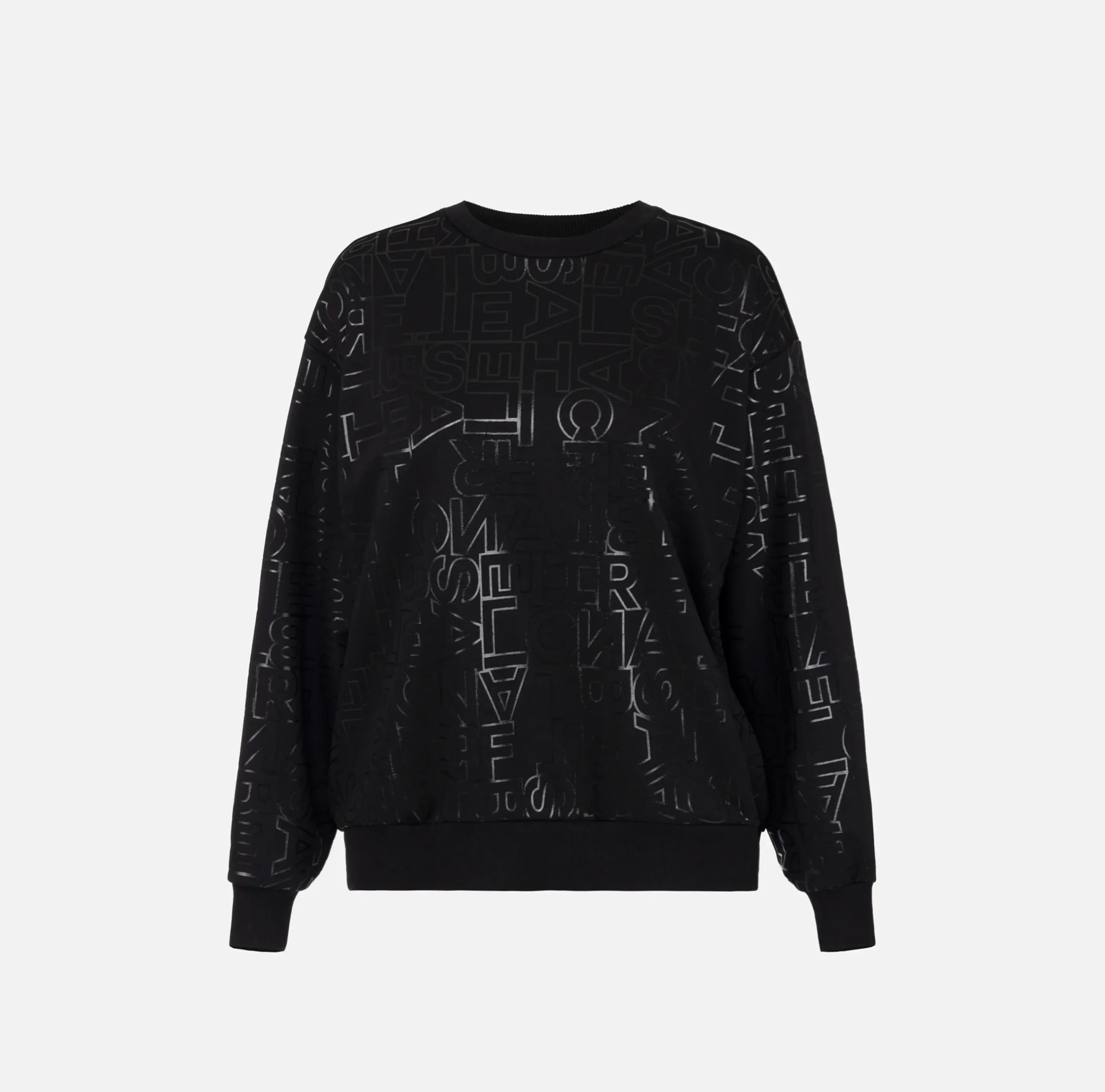 Felpa girocollo in cotone con lettering lucido all-over in tono. È caratterizzata da maniche con spalle scese e fondo elasticizzato.
