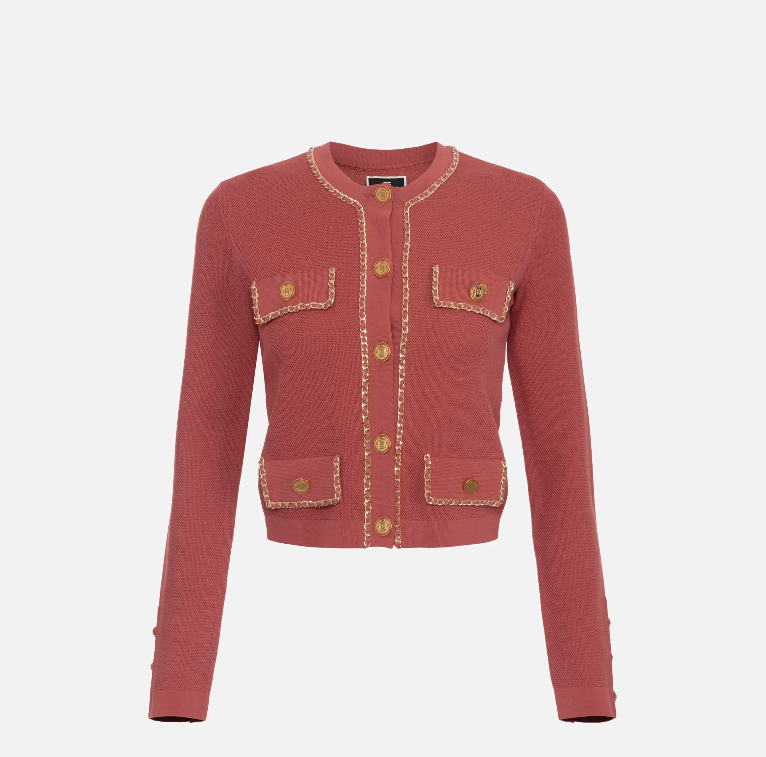 Giacca cropped in viscosa punto nido d’ape con chiusura monopetto con bottoni in metallo dorato. È caratterizzata da patte e scollo profilati da catena infilata.