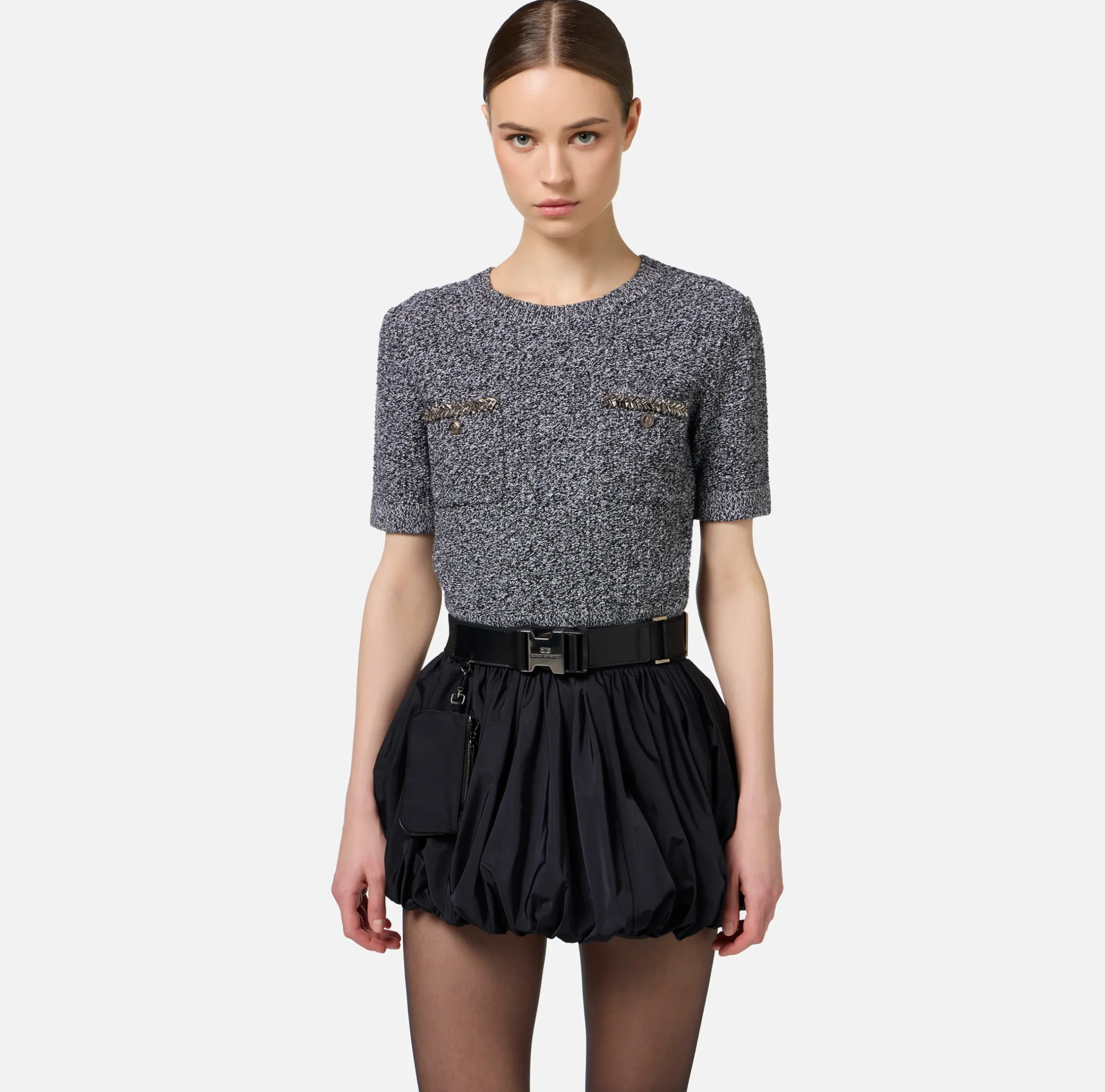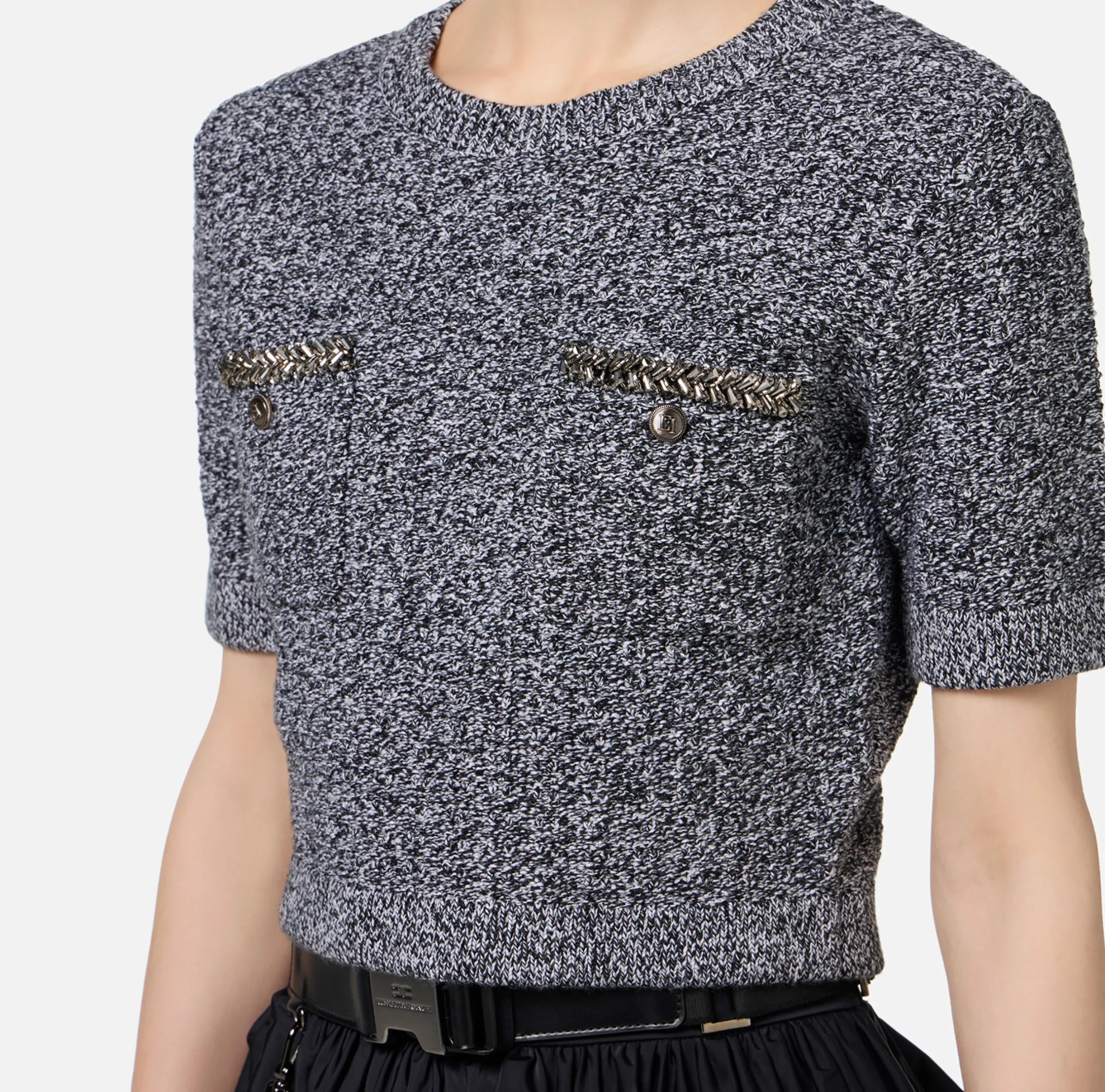 Maglia cropped in misto lana bouclé a maniche corte con scollo a giro. È caratterizzata da tasche a toppa rifinite da un ricamo di perline, canottiglie e bottoni logati in metallo silver.