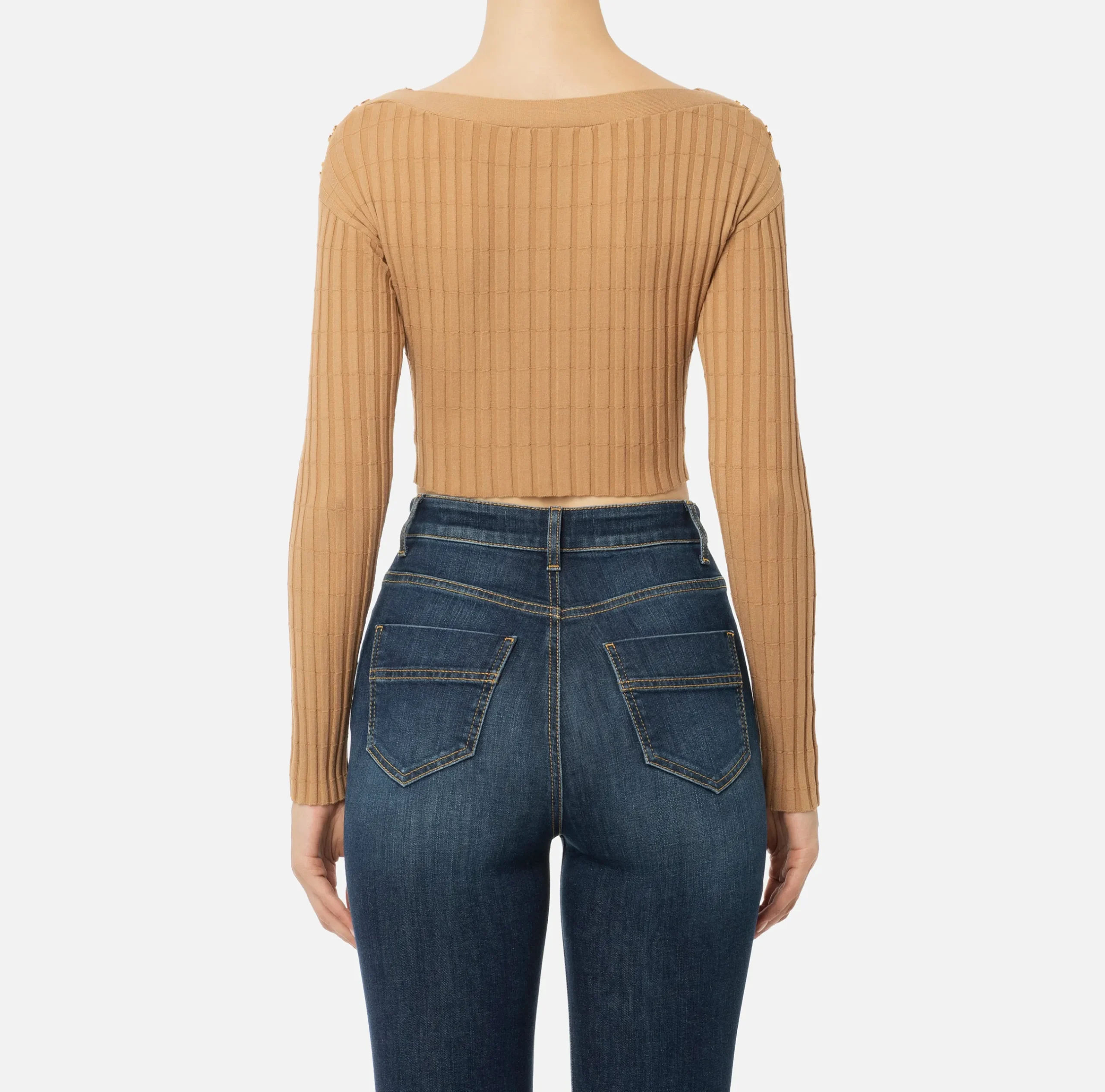 Maglieria E Felpe|Elisabetta Franchi Maglia cropped in viscosa a coste con bottoniera Camel