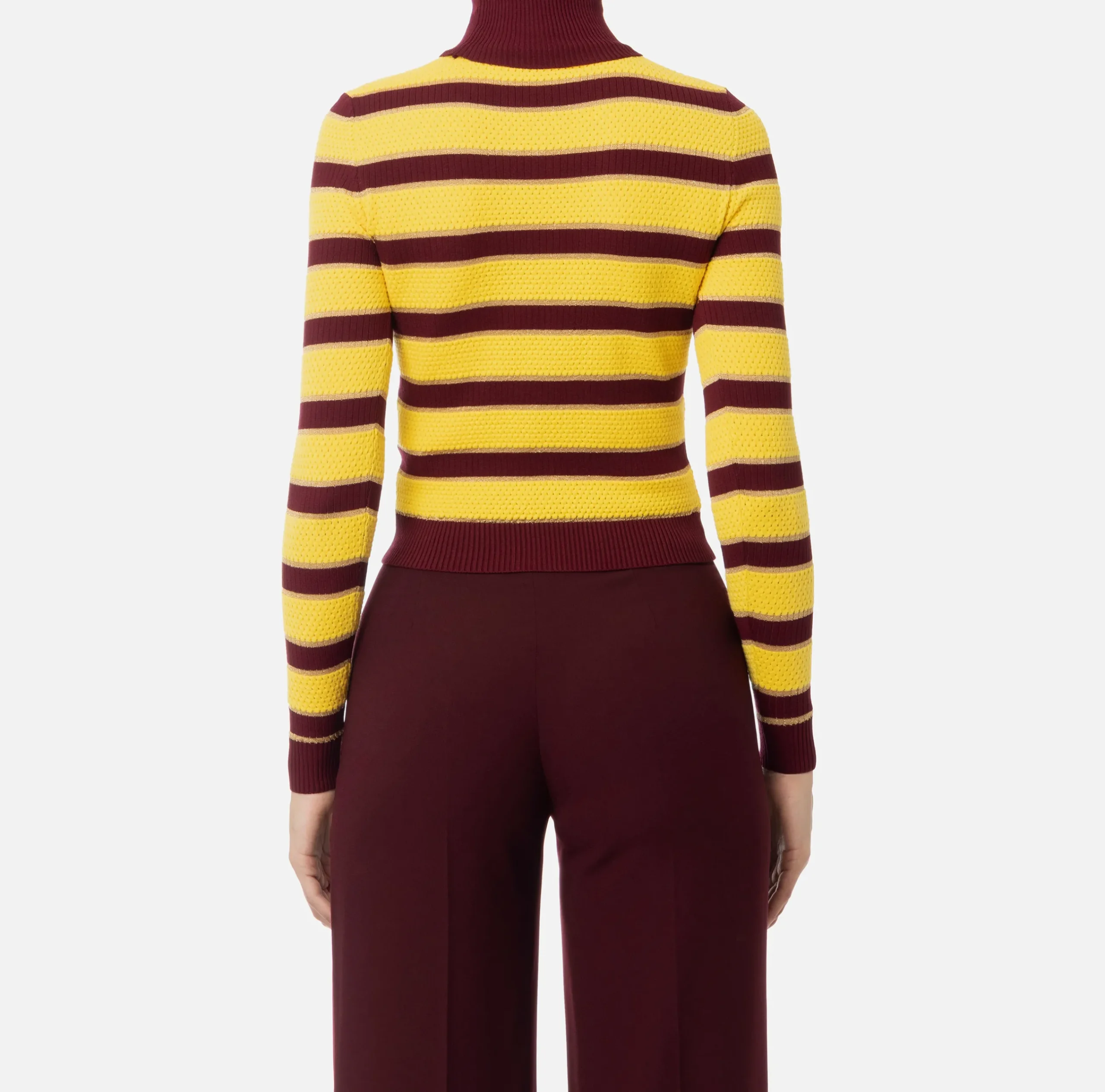 Maglia cropped in viscosa a maniche lunghe con collo alto. È caratterizzato da un’alternanza di punto nido d’ape, costine e riga in filo lurex che crea tridimensionalità.