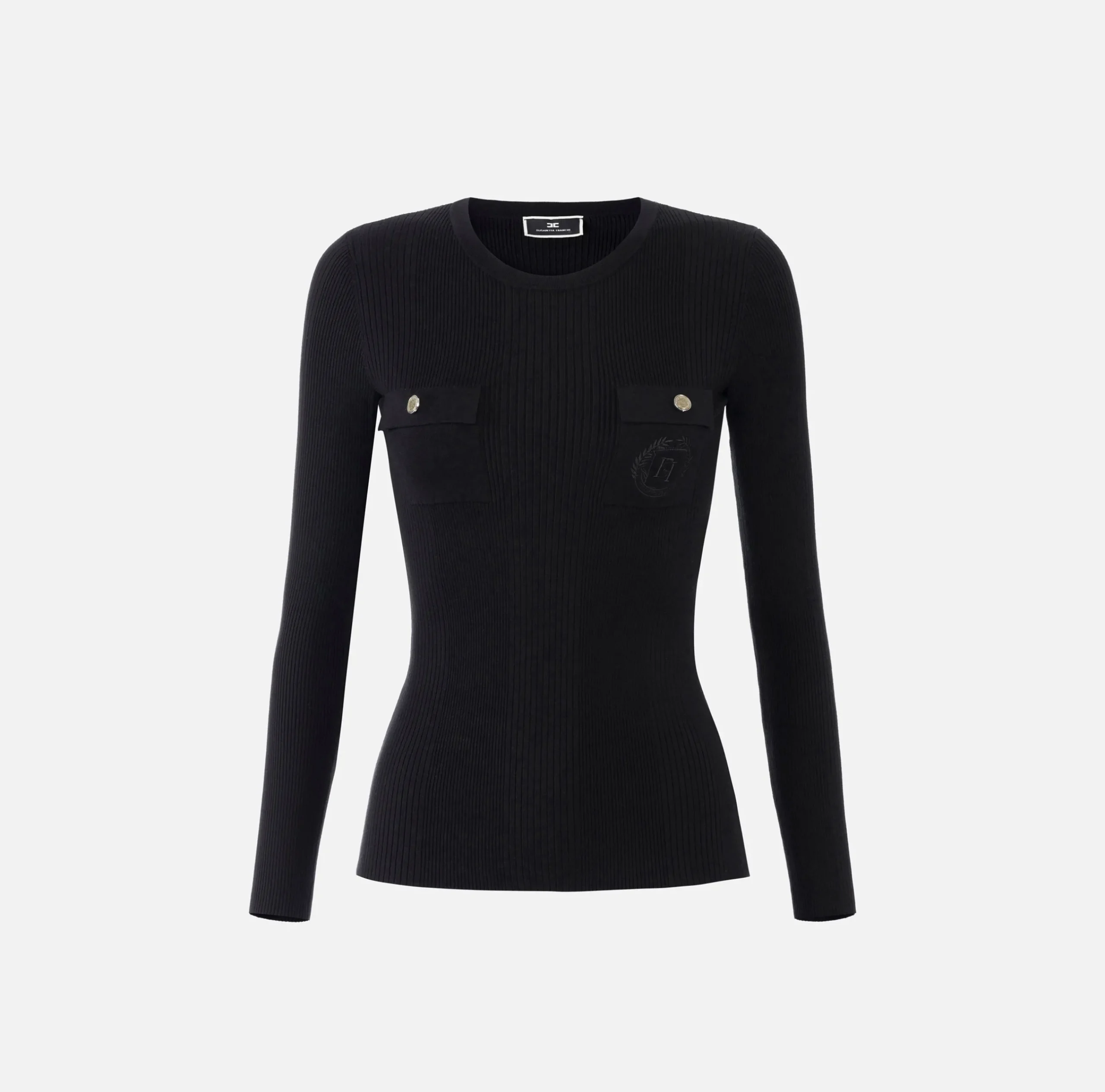 Maglia girocollo in lyocell e seta a costine a maniche lunghe con tasche con ricamo logo rifinite da bottoni in metallo dorato.