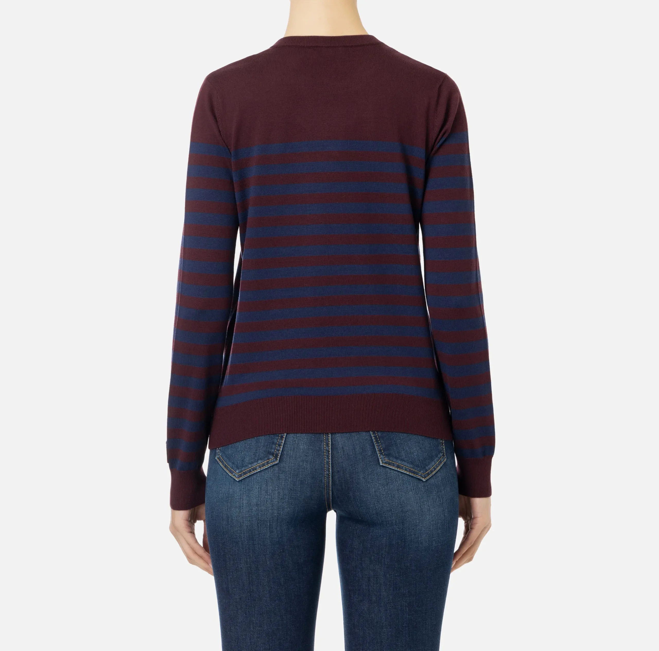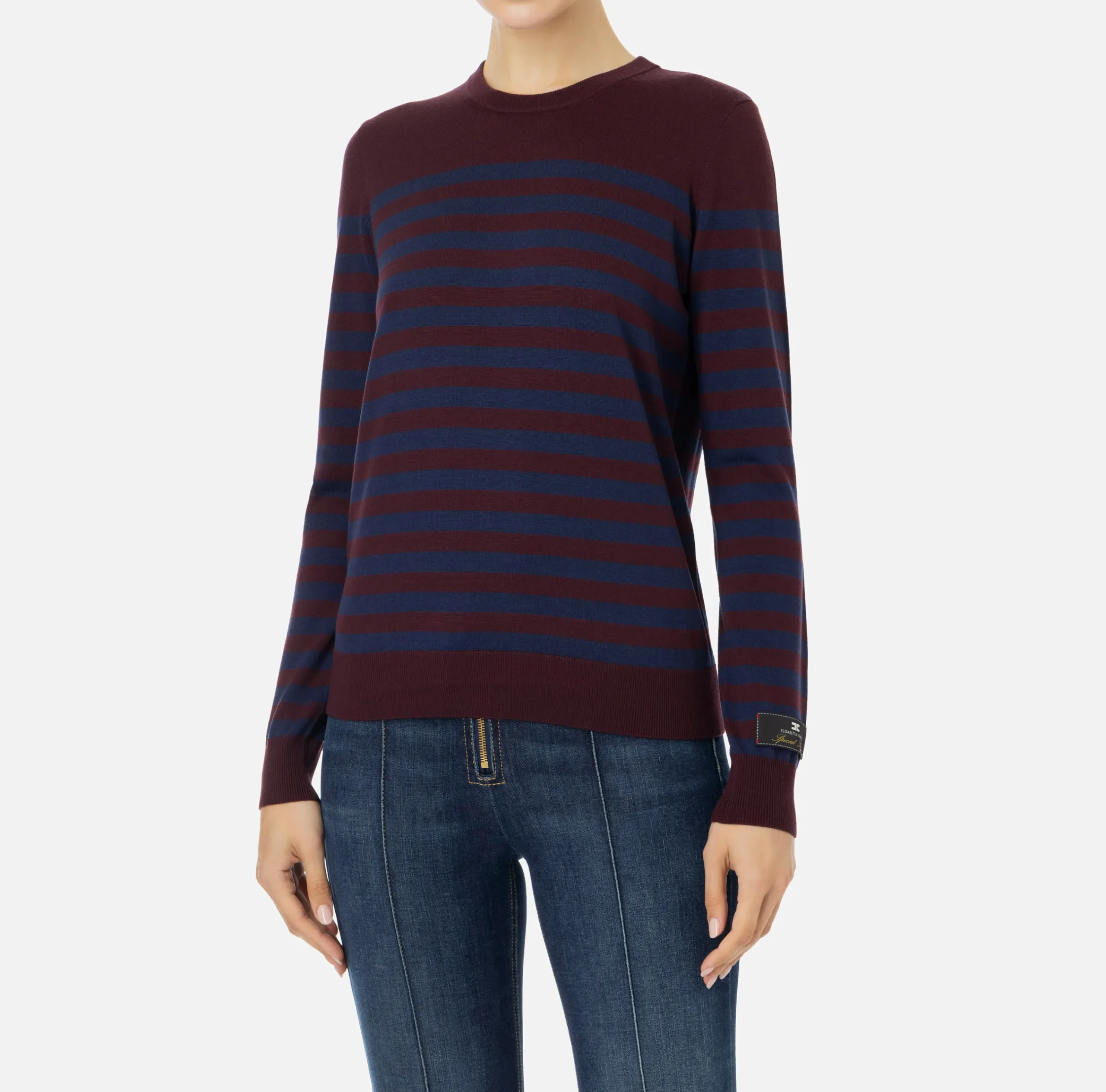 Maglia in lana a maniche lunghe con scollo a giro. Personalizza il capo l’etichetta jacquard logata cucita sul polso.
