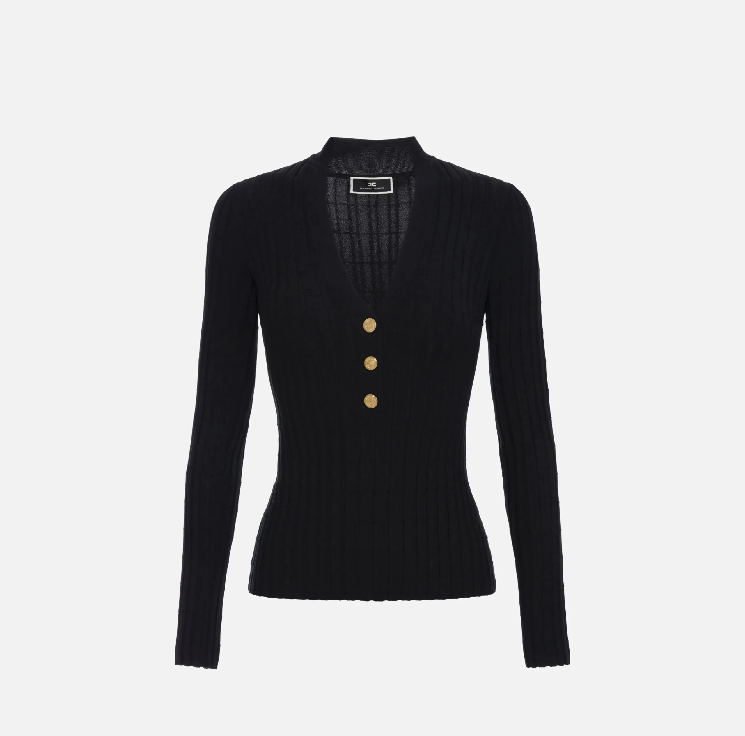 Maglia in viscosa a coste con maniche lunghe. È caratterizzata da colletto in piedi, scollo a V e finta abbottonatura in metallo dorato.