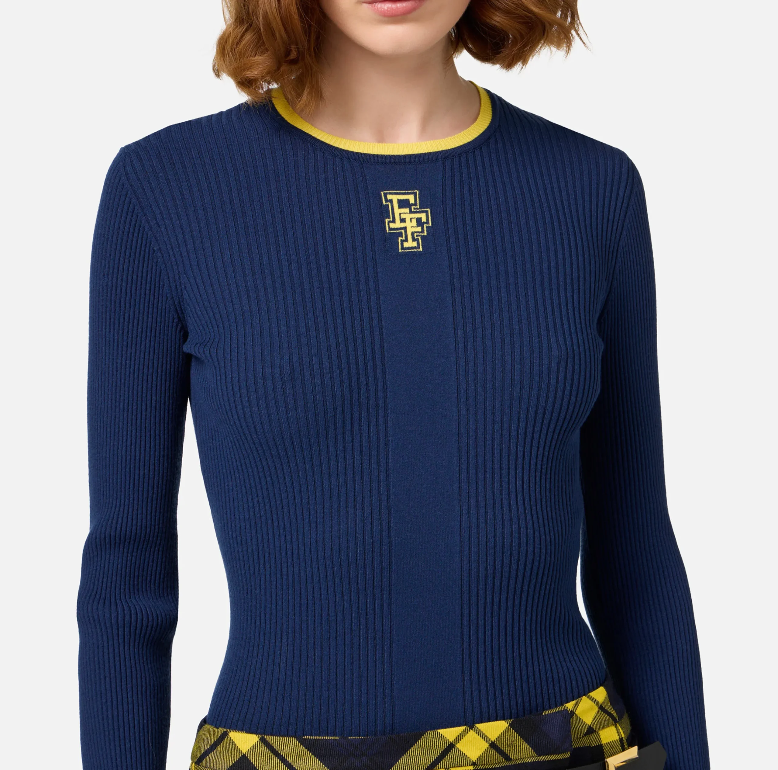 Maglia in misto viscosa a costine a maniche lunghe con scollo a giro. È caratterizzata da profili e logo intarsiato in contrasto colore.