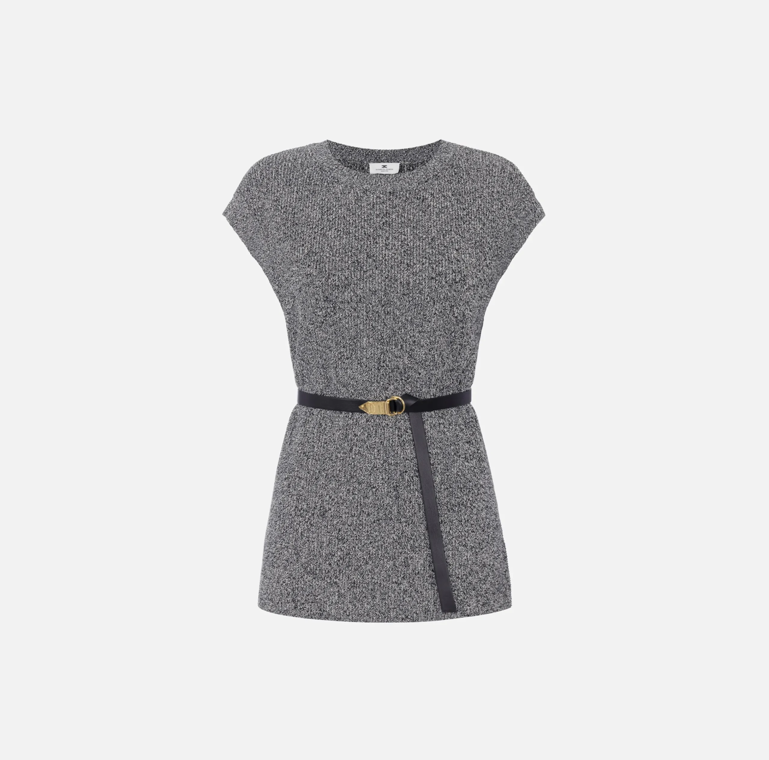 Maglia smanicata in misto viscosa mélange con scollo a giro. Il punto vita è enfatizzato da una cintura in materiale sintetico effetto pelle con allacciatura a nodo.