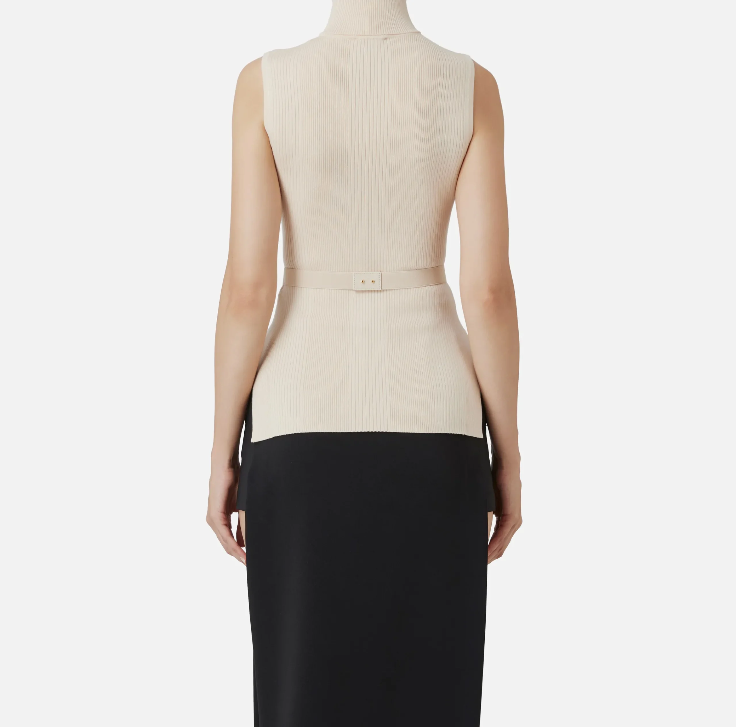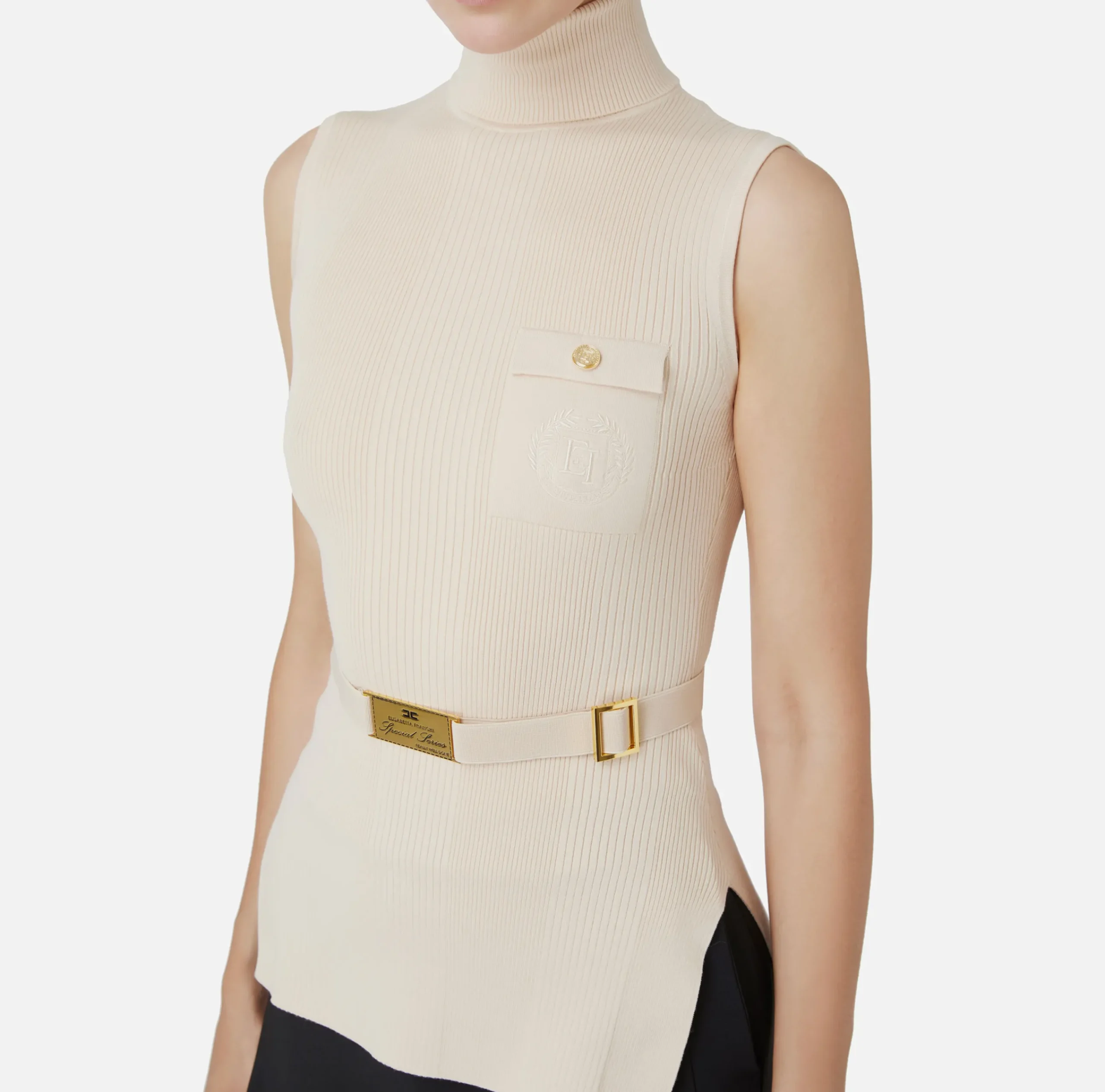 Top dolcevita in lyocell e seta a costine con tasca con ricamo logo rifinita da bottoni in metallo dorato. Il punto vita è enfatizzato da una cintura in elastico logato con fibbia in metallo dorato.