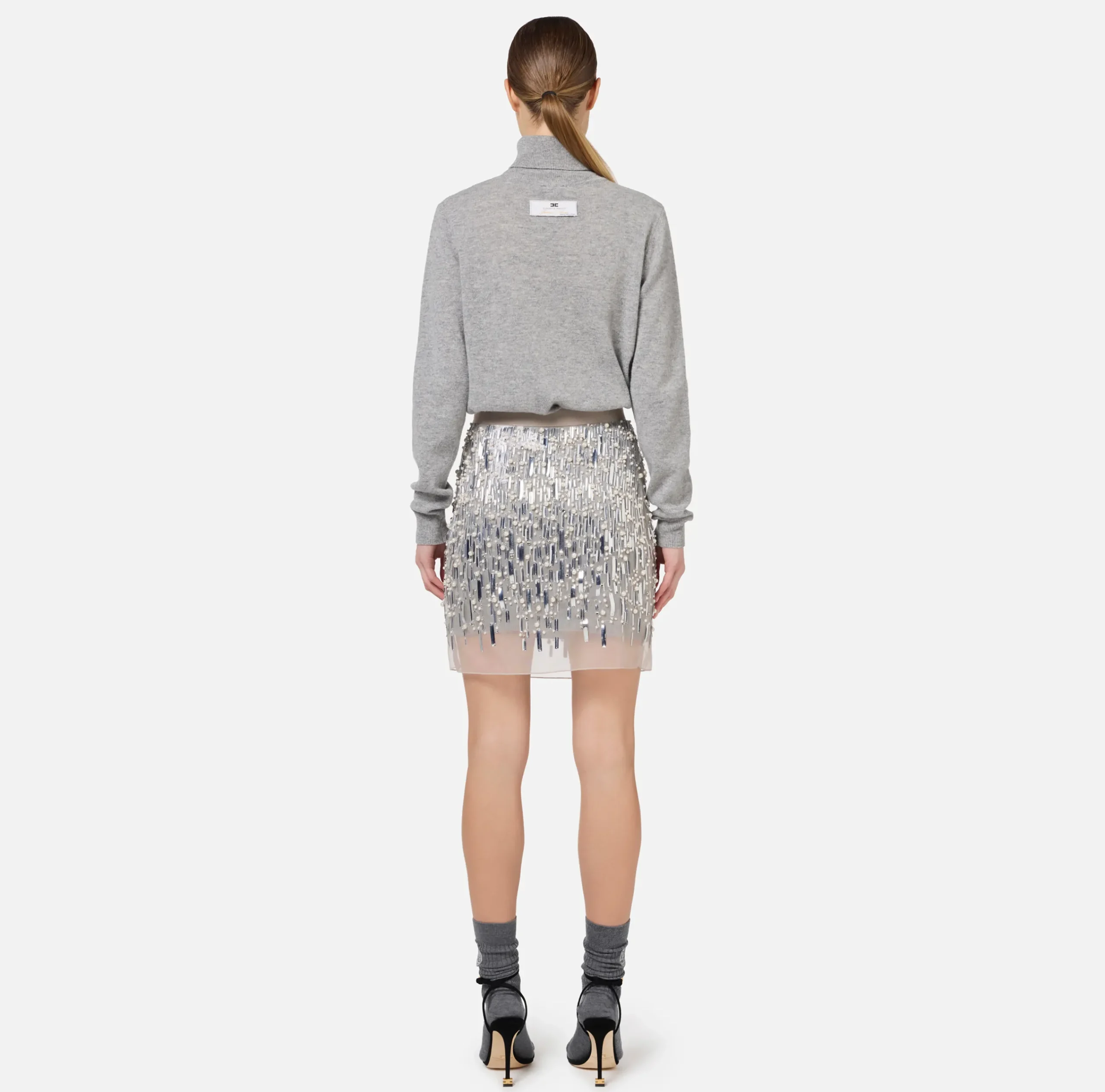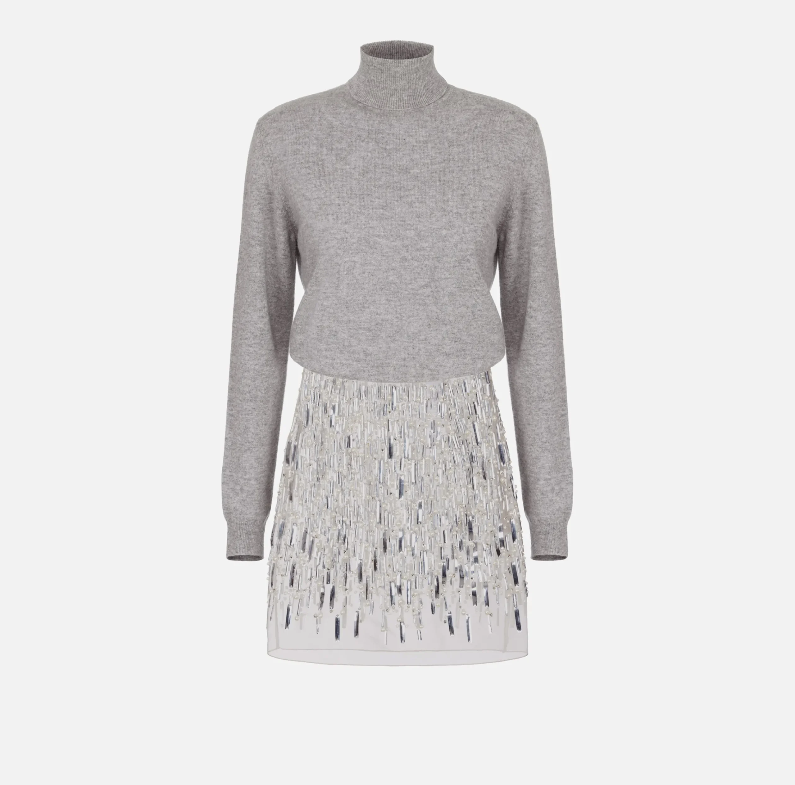 Miniabito dolcevita in misto lana a maniche lunghe. È caratterizzato da minigonna in organza interamente ricamata in paillettes e perle.