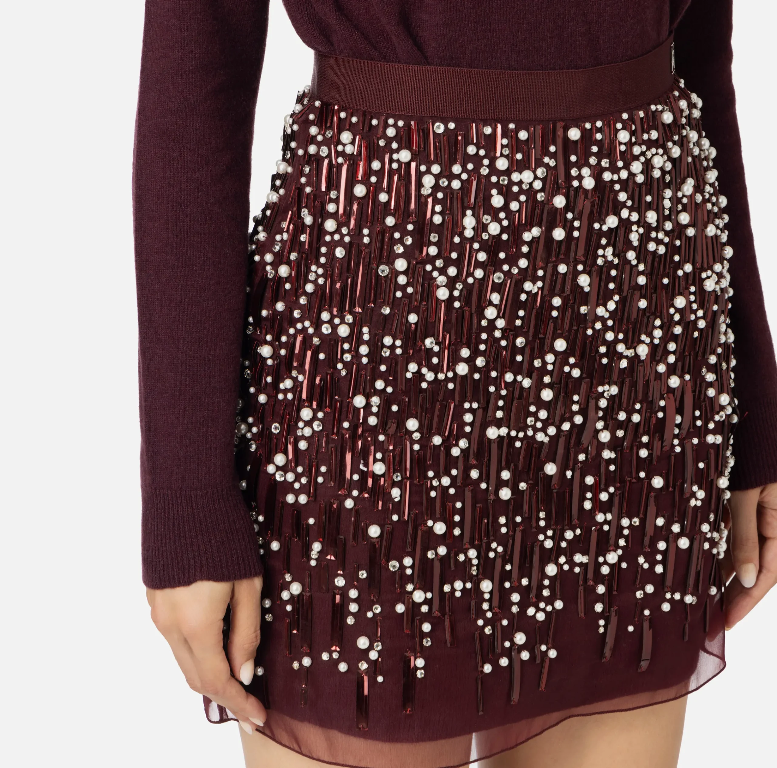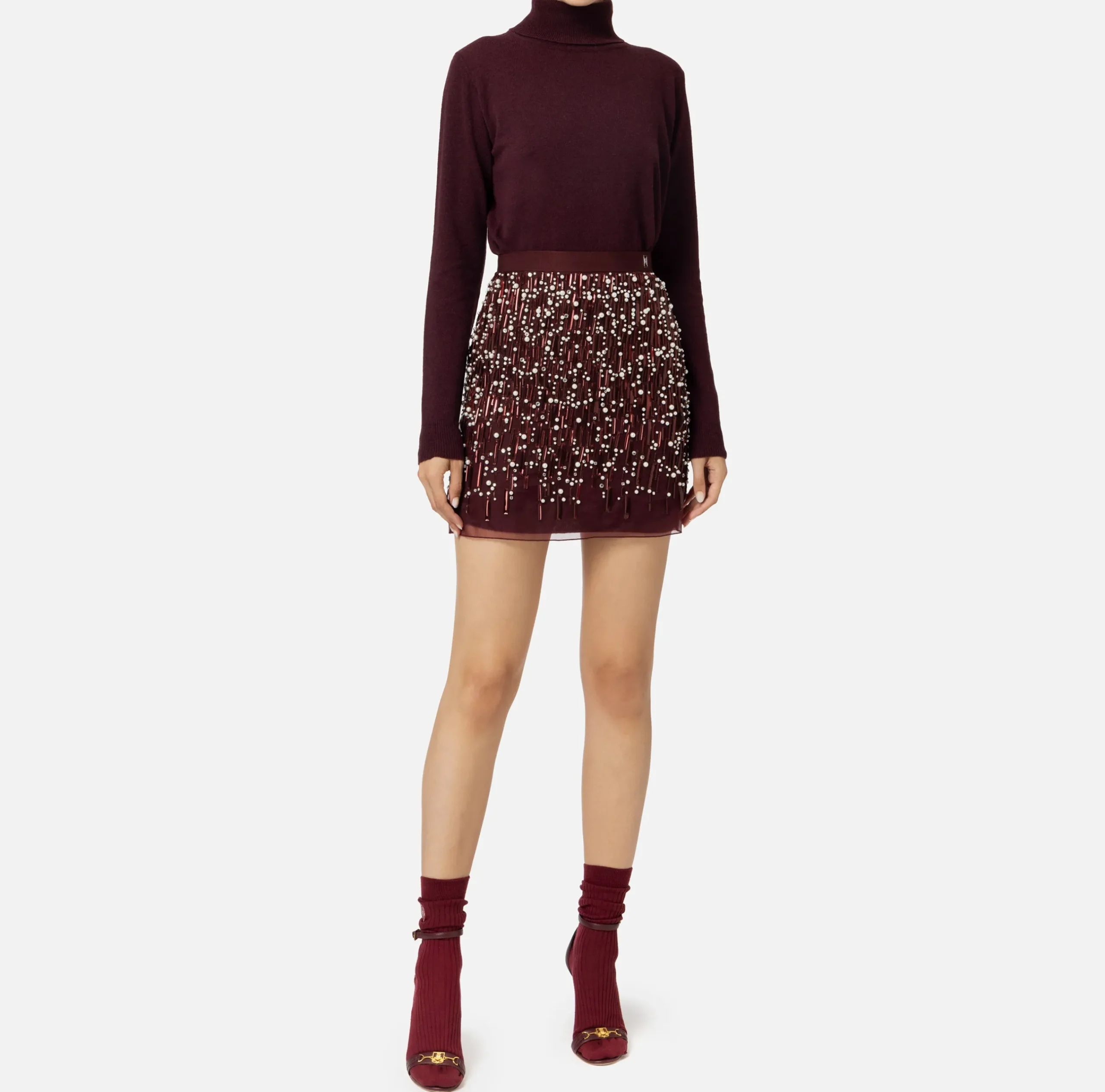 Miniabito dolcevita in misto lana a maniche lunghe. È caratterizzato da minigonna in organza interamente ricamata in paillettes e perle.