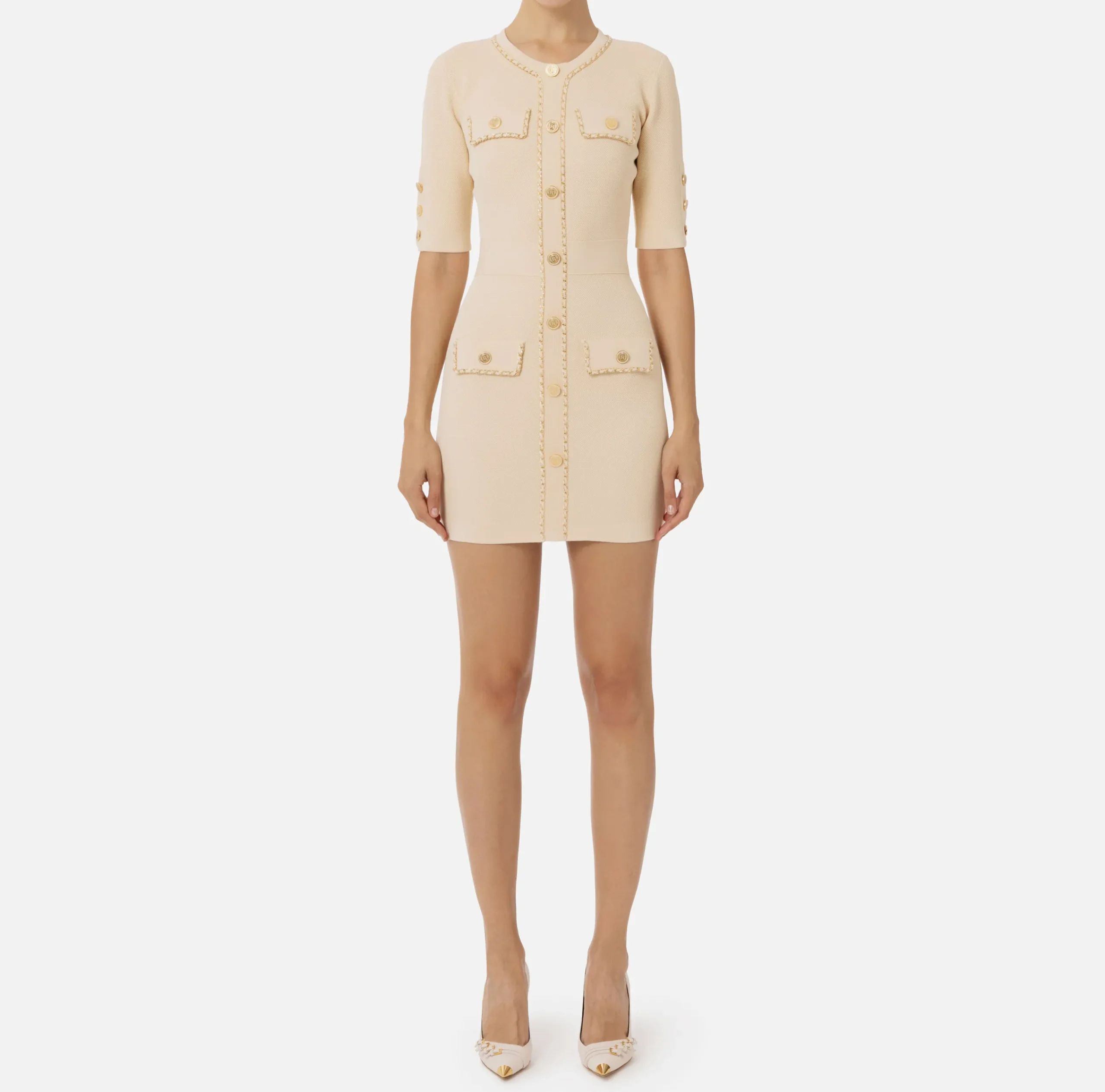 Miniabito in viscosa punto nido d’ape a maniche corte con chiusura monopetto con bottoni in metallo dorato. È caratterizzato da patte e scollo profilati da catena infilata.