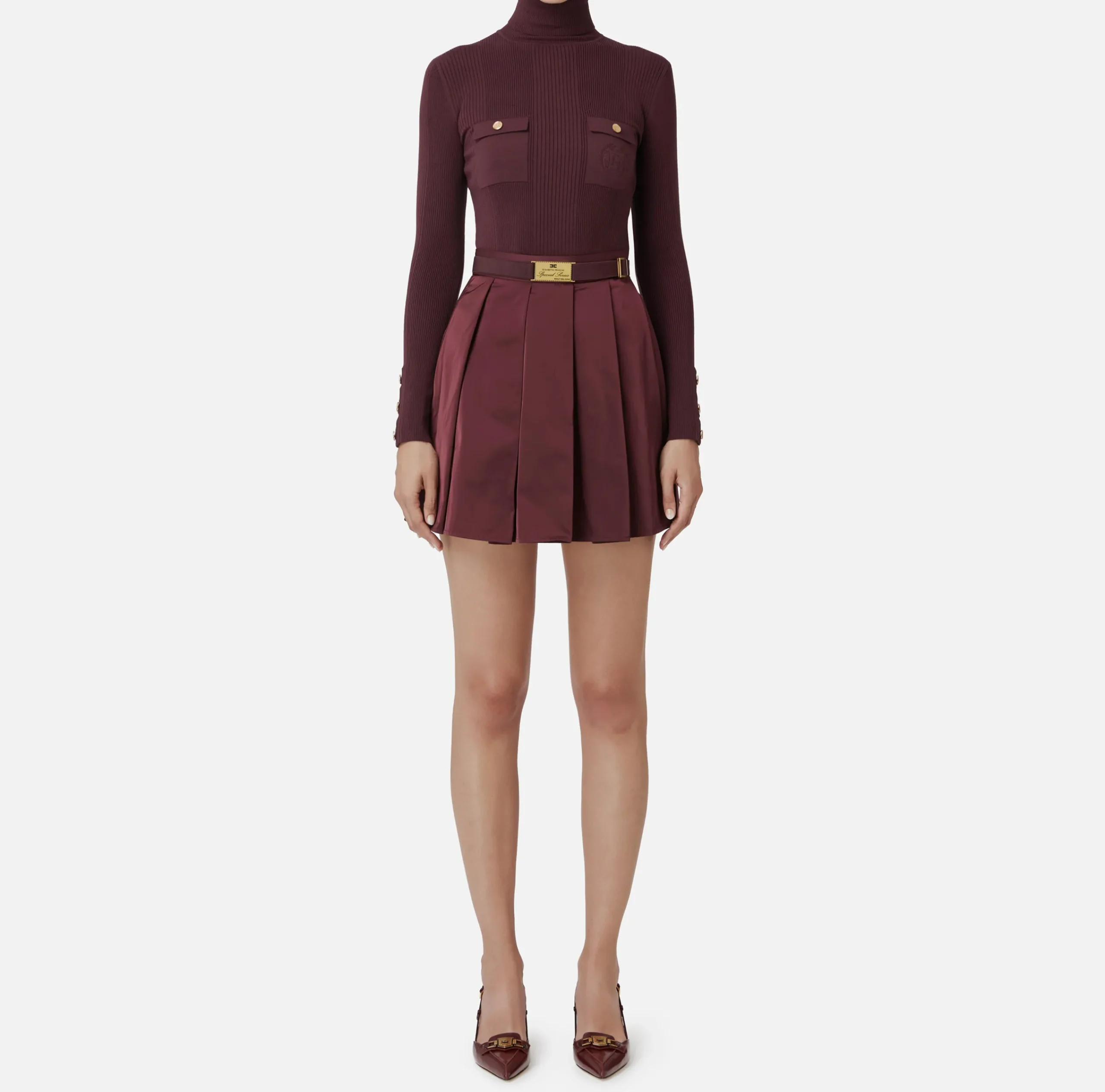 Miniabito in viscosa e seta a costine a maniche lunghe con collo alto e tasche con ricamo logo rifinite da bottoni in metallo dorato. Il punto vita è enfatizzato da una cintura in elastico con fibbia in metallo dorato che sovrasta la gonna a pieghe in nylon.
