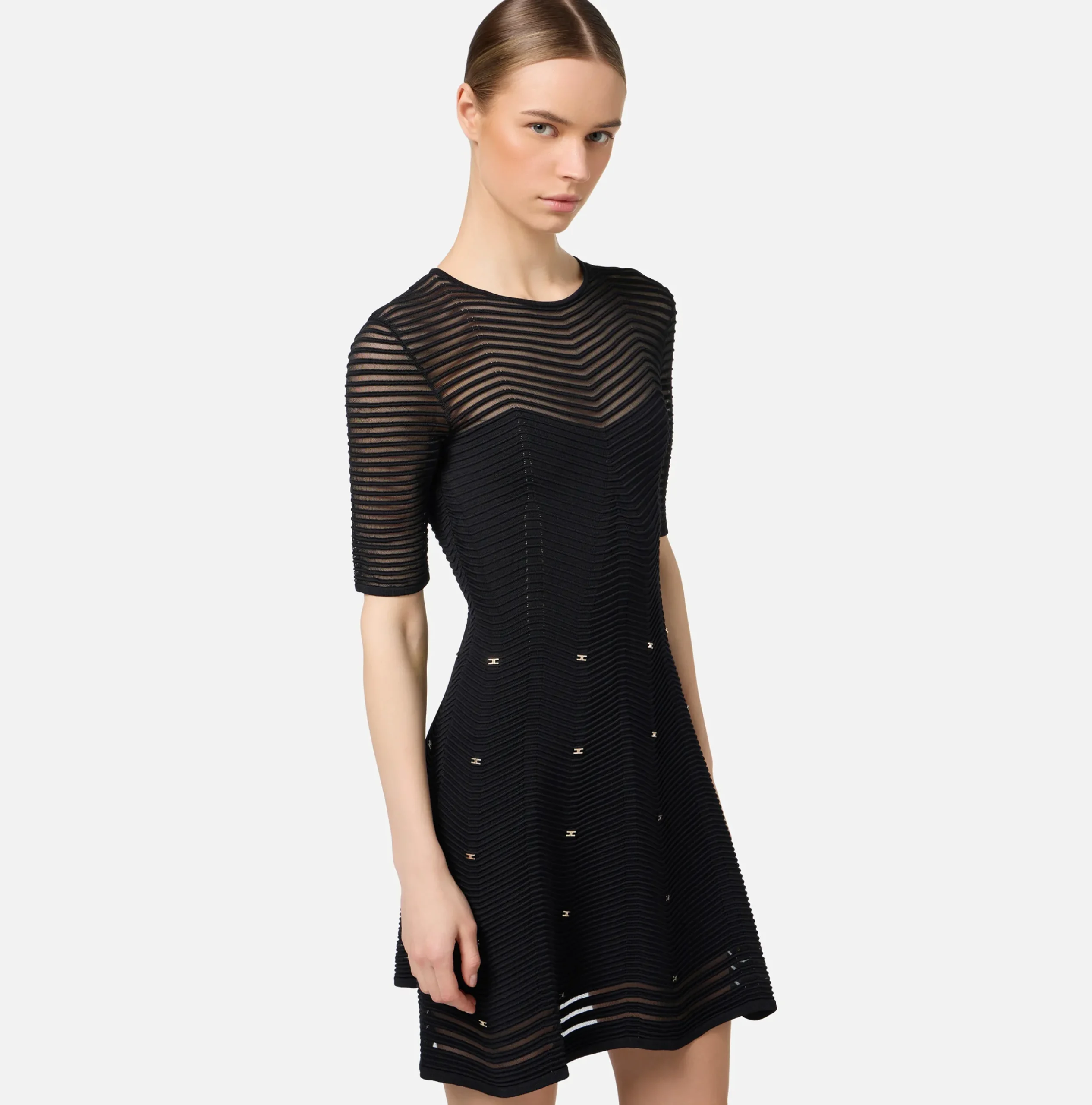 Miniabito in viscosa motivo chevron tridimensionale alternato a un punto rete. È caratterizzato da scollo a giro, maniche corte trasparenti e gonna svasata rifinita da piccoli loghi in metallo dorato.