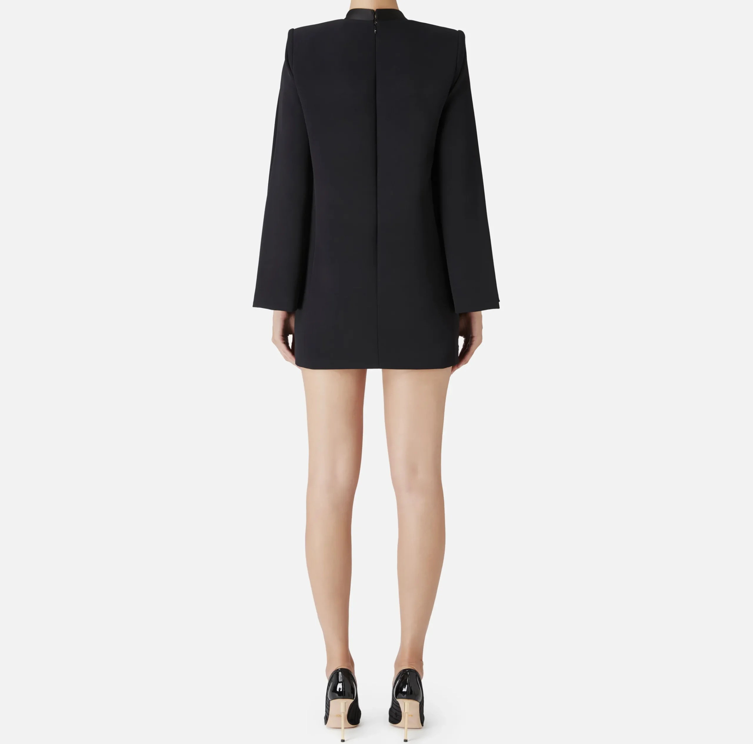 Abito boxy in crêpe stretch a maniche lunghe con apertura laterale e tasche a filetto in raso. È caratterizzato da spalle strutturate e profondo scollo a V con revers sciallato in raso.