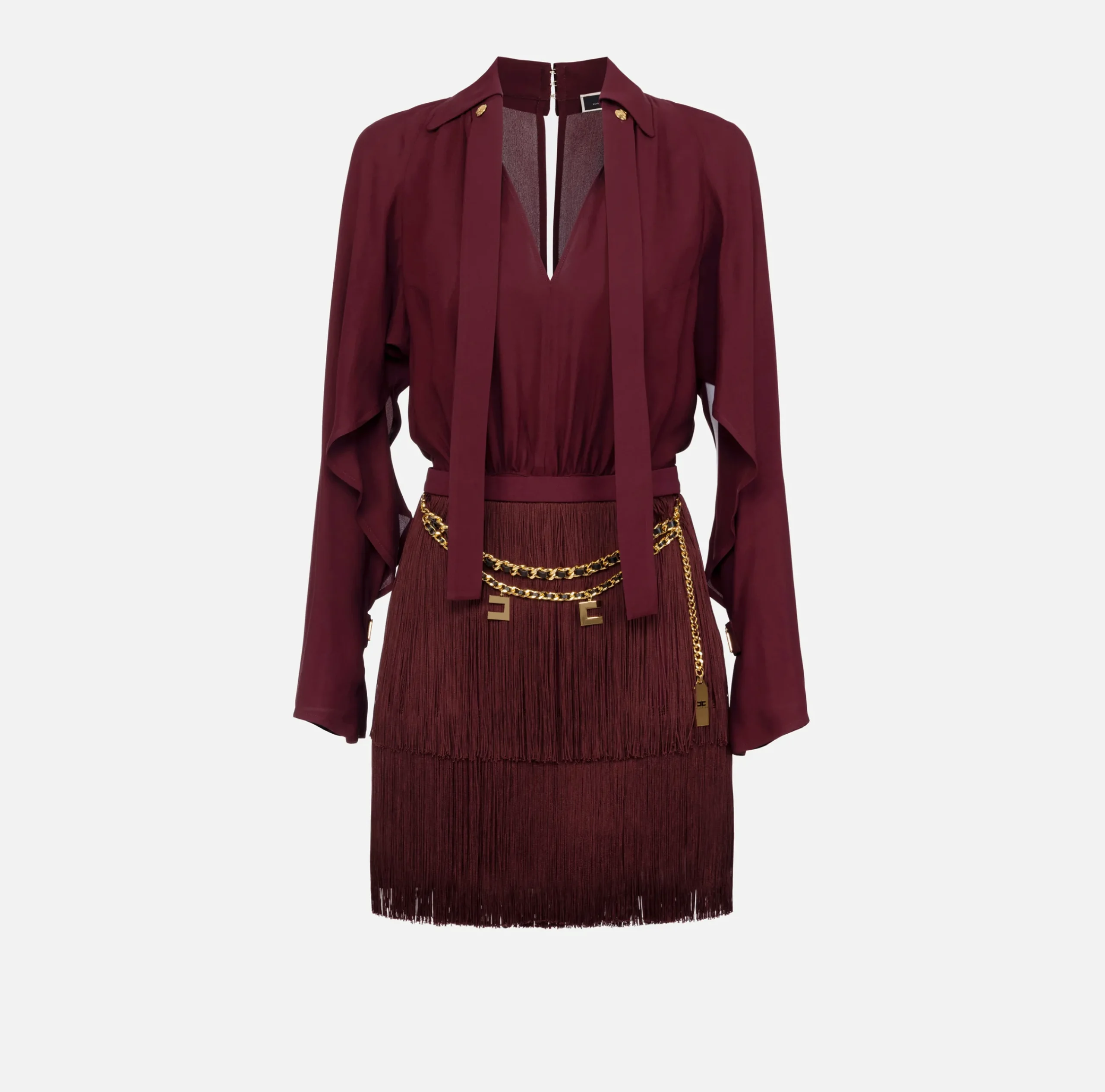 #html-body [data-pb-style=Q6PNVEQ]{margin:0;padding:0}Abito con frange sulla gonna in crêpe, camicia in georgette, e foulard trattenuto da bottoni in metallo dorato. Il punto vita è enfatizzato da una cintura in metallo dorato con charms logo.