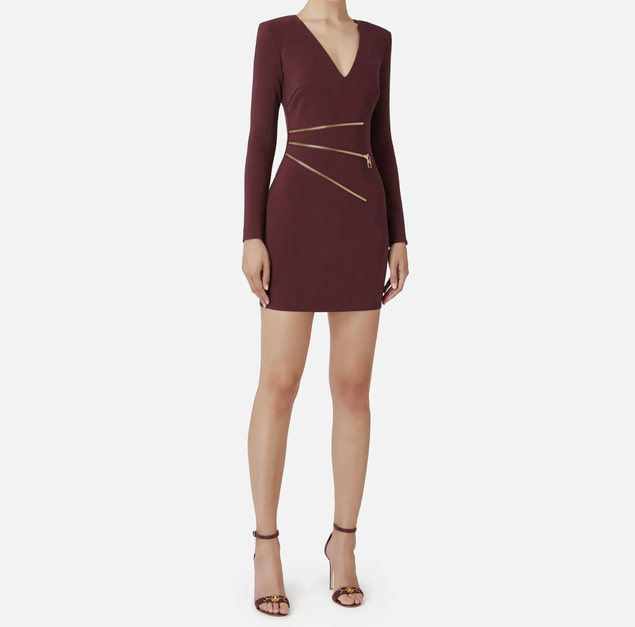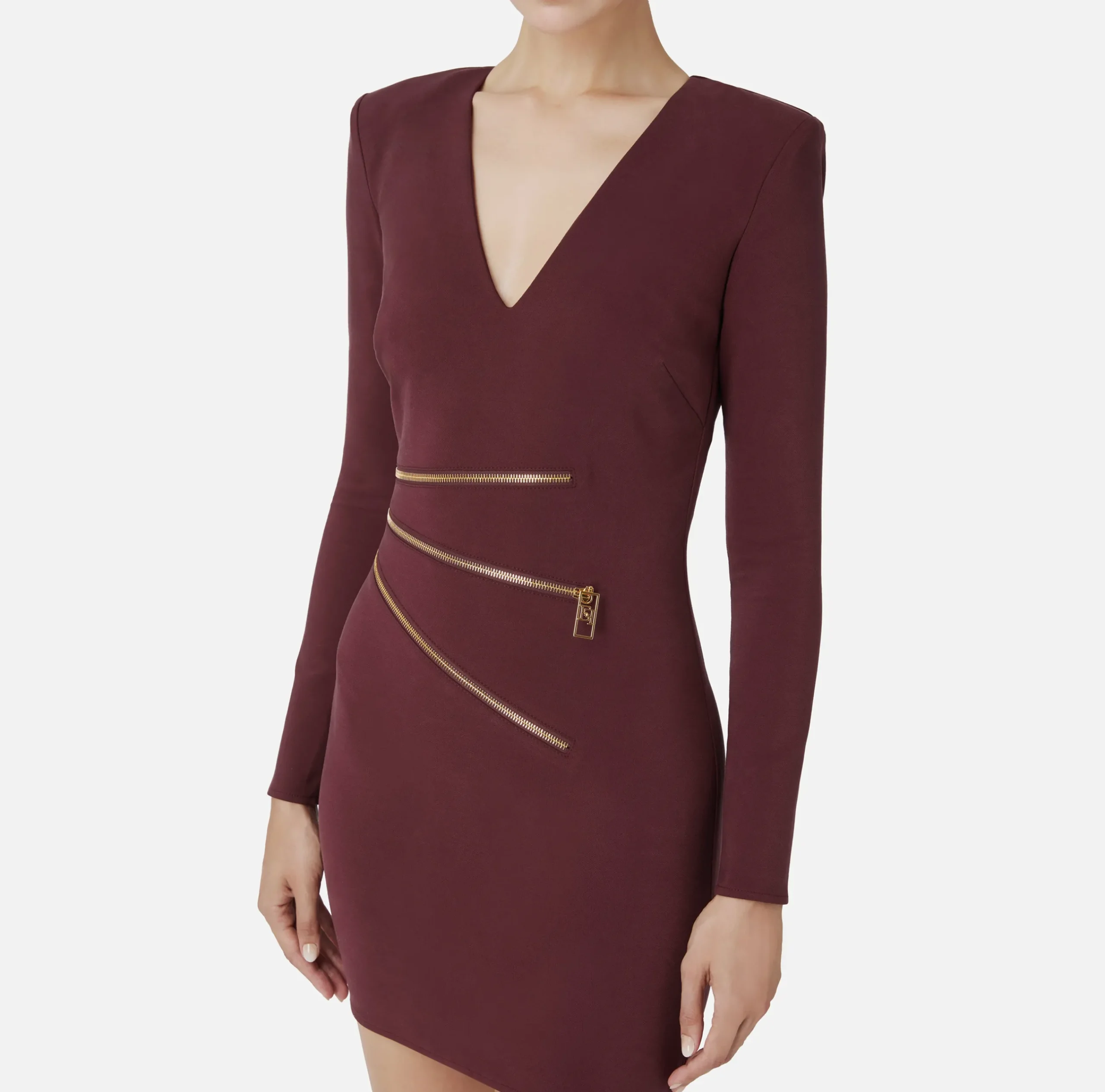 Miniabito in crêpe a maniche lunghe a guanto e scollo a V. È caratterizzato da zip con tiretto logo in metallo dorato posizionate sul fianco.