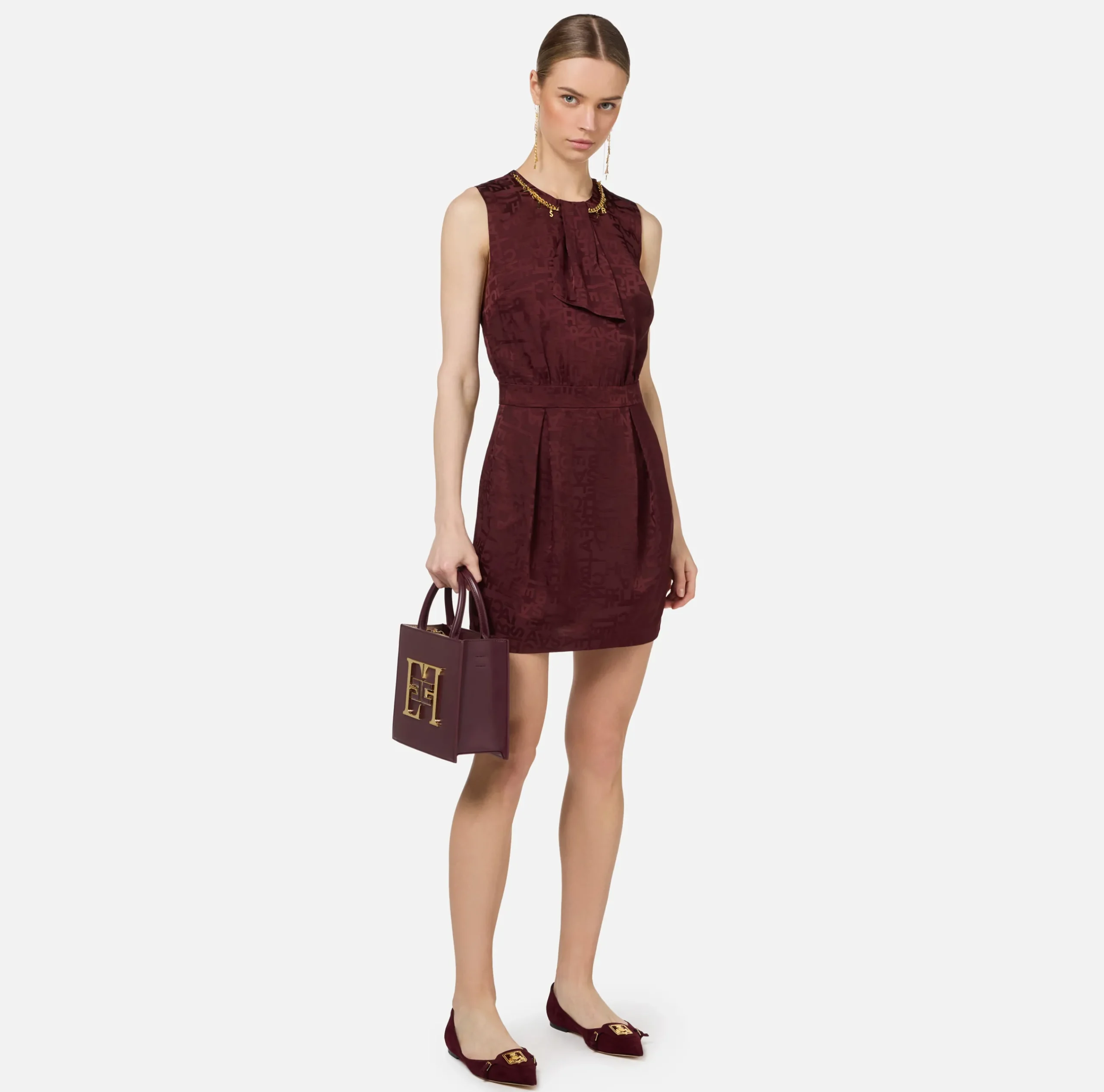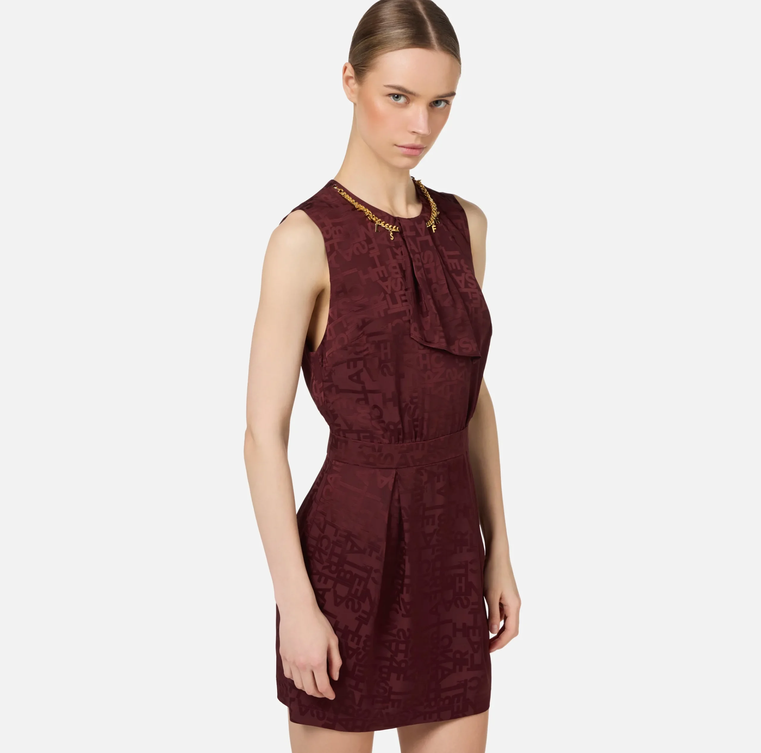 Miniabito smanicato in crêpe jaquard lettering con fascione in vita. È caratterizzato da foulard al collo stazzabile e collana in metallo dorato con charms logo.