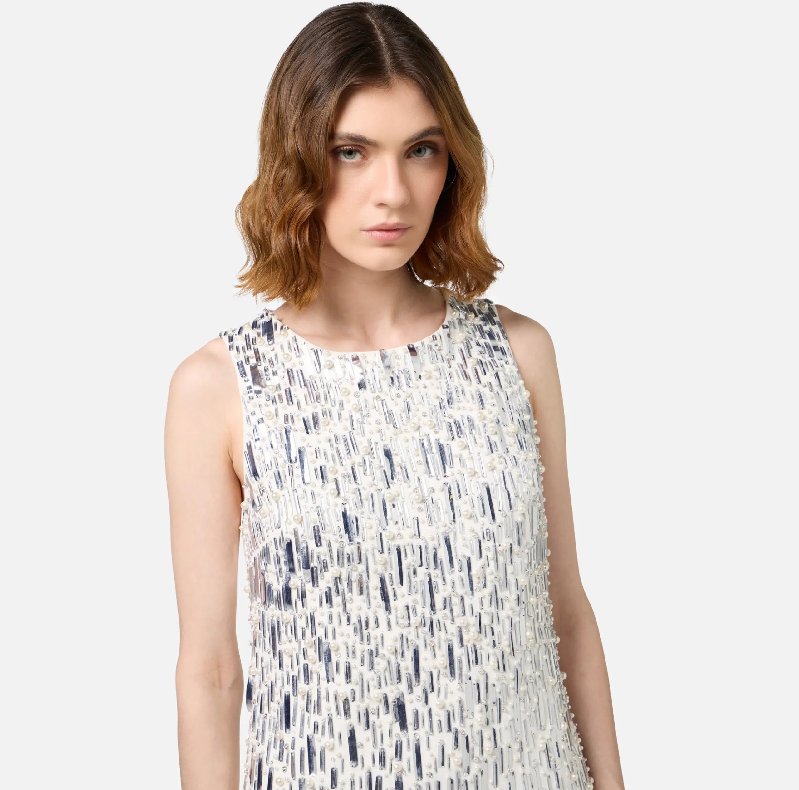 Miniabito in crêpe con scollo a giro e ricamo frontale di perle e paillettes rettangolari effetto degradé.