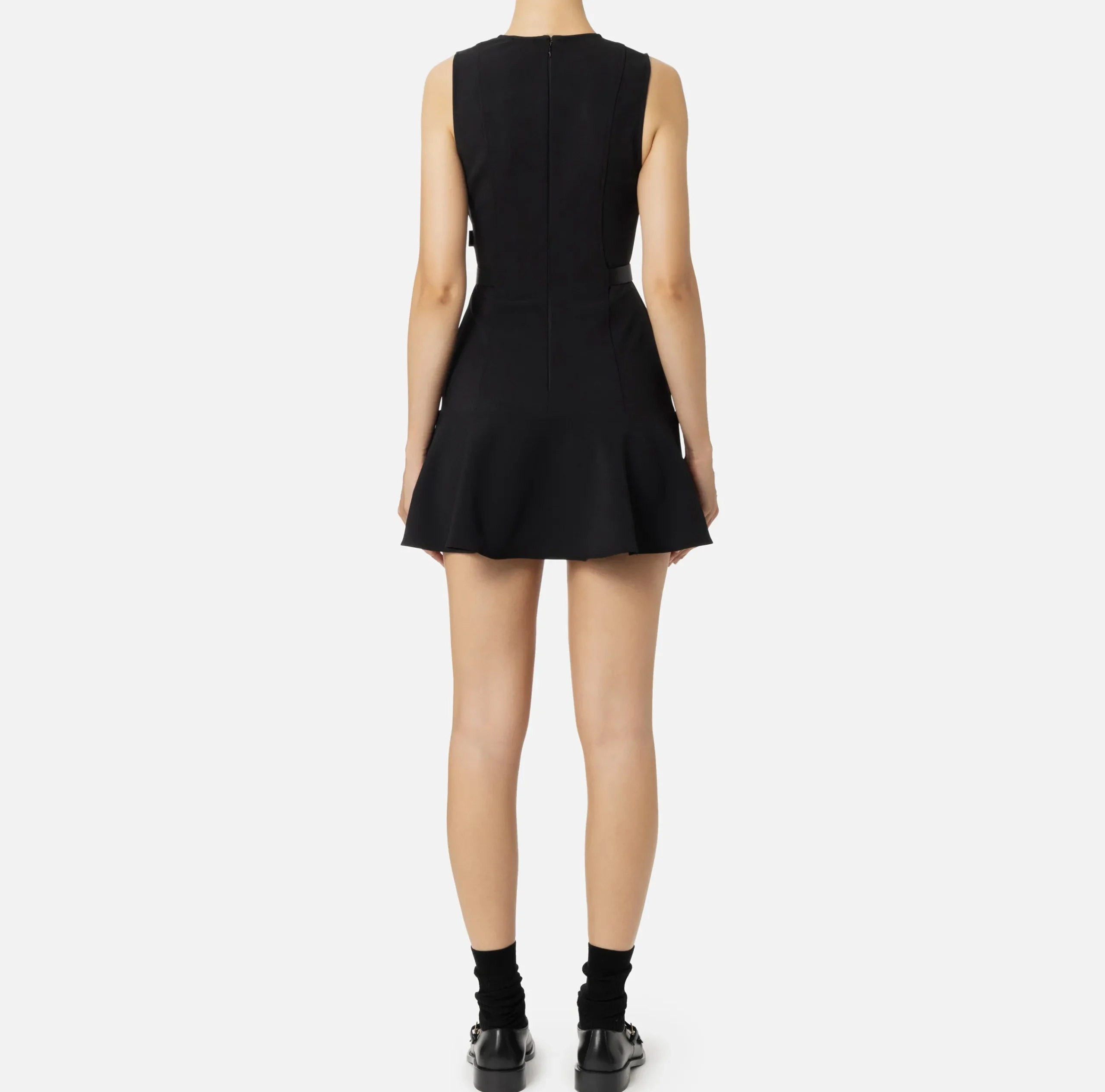 Miniabito in crêpe stretch con scollo incrociato e gonna con balza al fondo. Il punto vita è enfatizzato da motivo di cinturini in materiale sintetico effetto pelle con placca logo in metallo dorato.