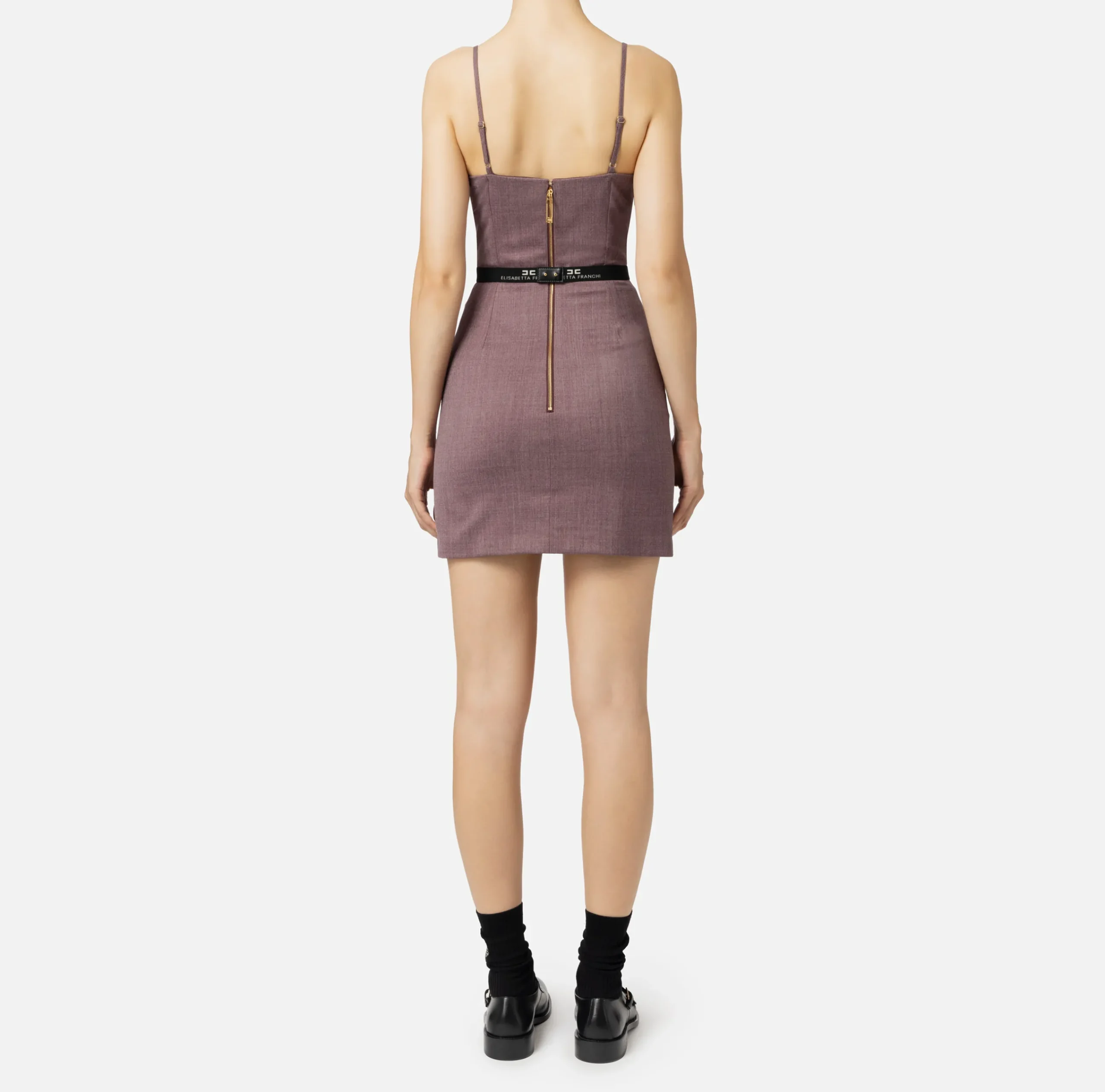 Miniabito in fresco lana mélange con motivo di doppio scollo e spacchi laterali sul davanti. Il punto vita è enfatizzato da una cintura in elastico logato con fibbia a scatto in metallo dorato.