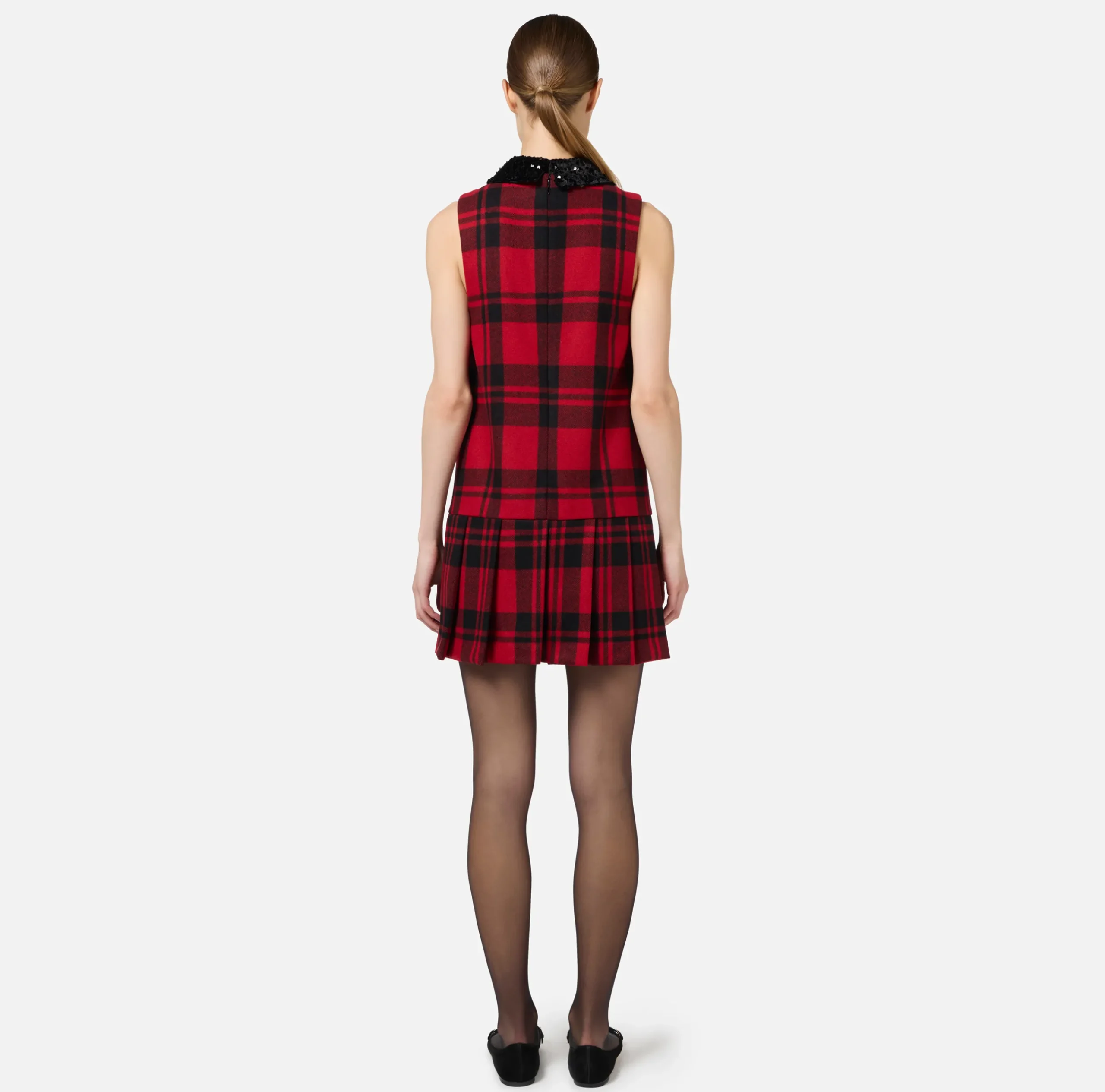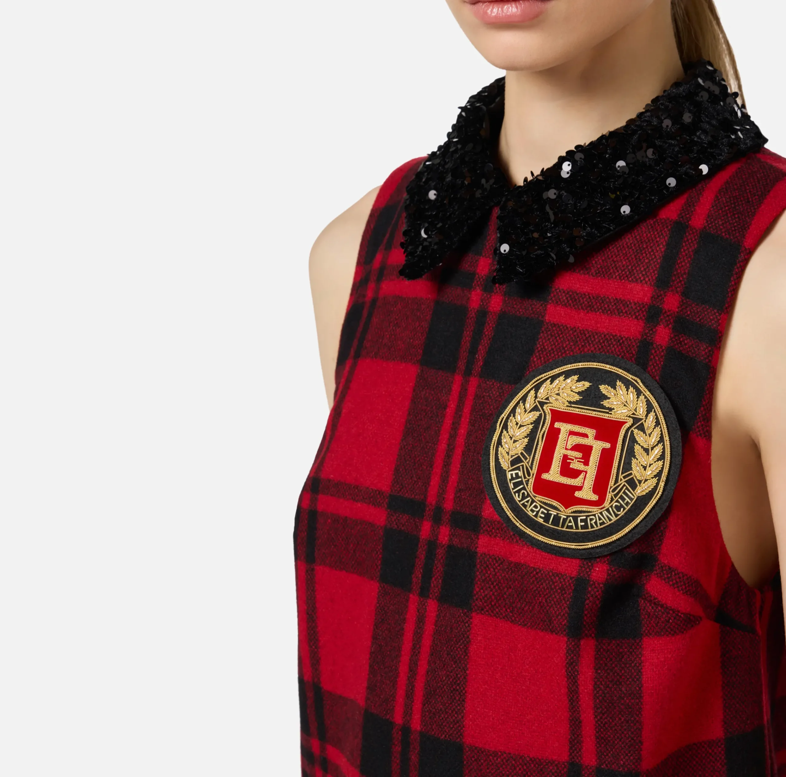 Miniabito in lana tartan smanicato con balza a pieghe sul fondo. È caratterizzato da colletto a camicia staccabile in ciniglia ricamata con paillettes e patch stemma logo al petto.