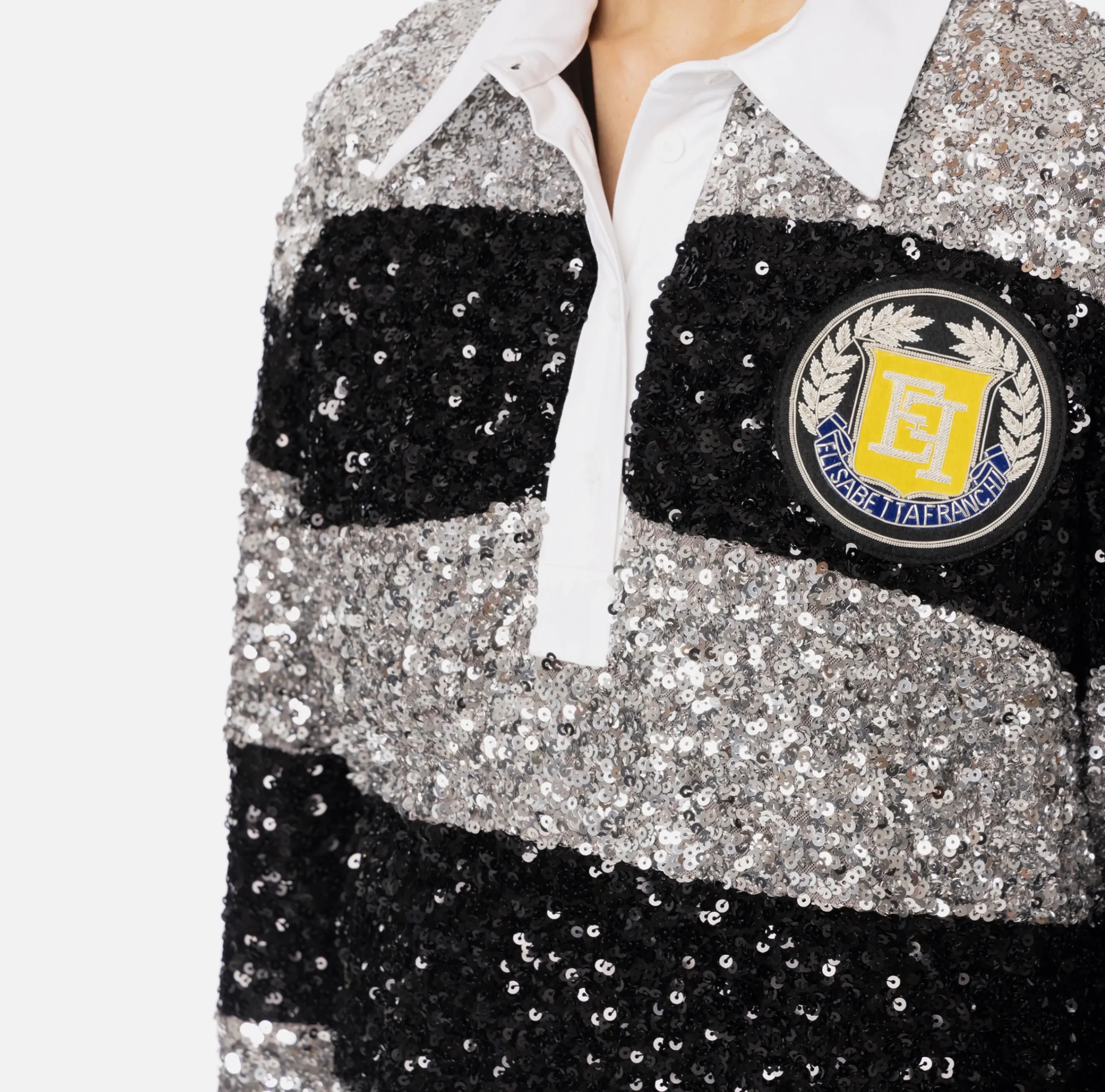Miniabito in paillettes a righe di due colori con maniche lunghe e spalle scese. È caratterizzato da colletto a camicia in cotone in contrasto colore e patch logo ricamato al petto.