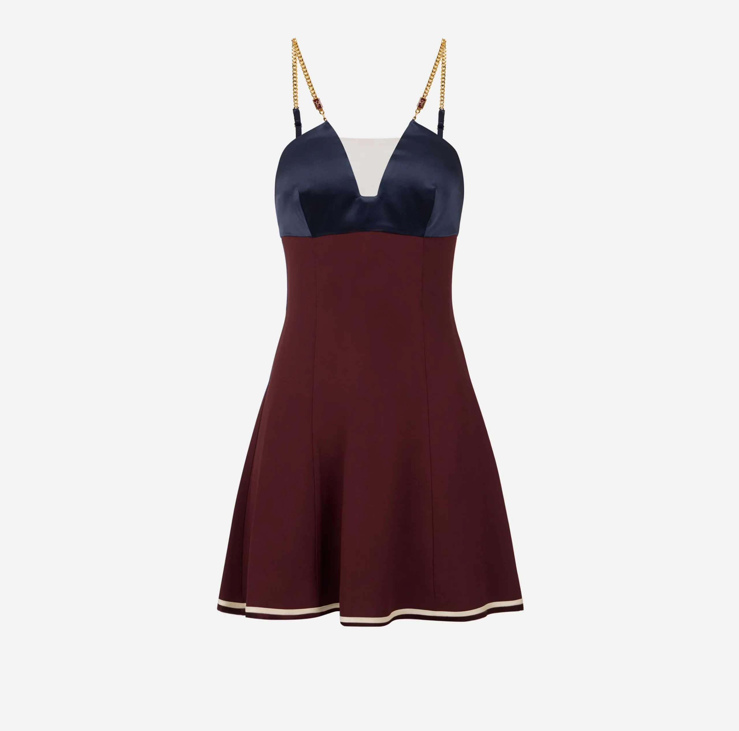 Miniabito in enver satin bicolor con gonna svasata al fondo. È caratterizzato da top dalla scollatura in tulle sostenuto da spalline in catena groumette con terminalini logati.