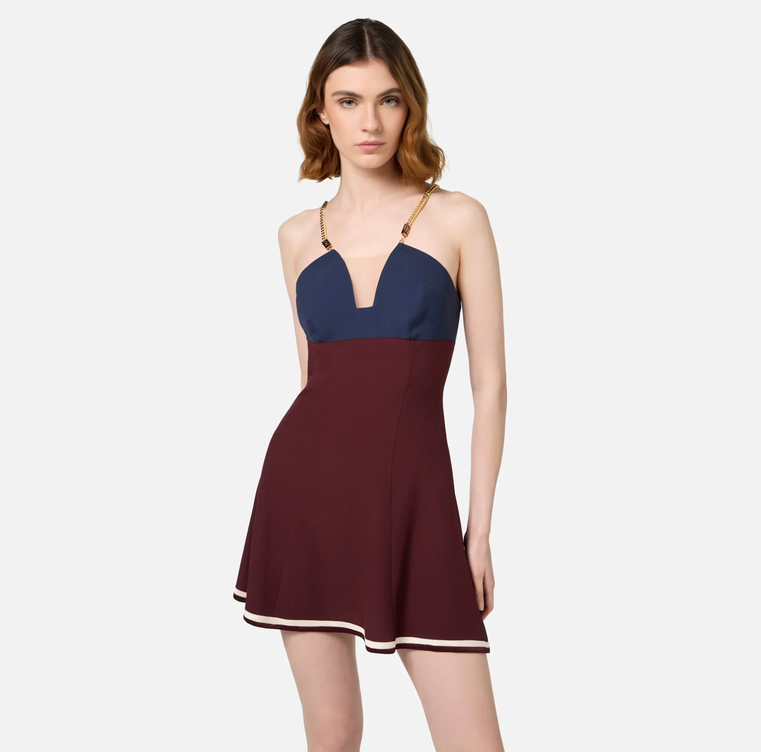 Mini Abiti|Abiti|Elisabetta Franchi Miniabito in satin con catena groumette Navy/RougeNoir/Burro