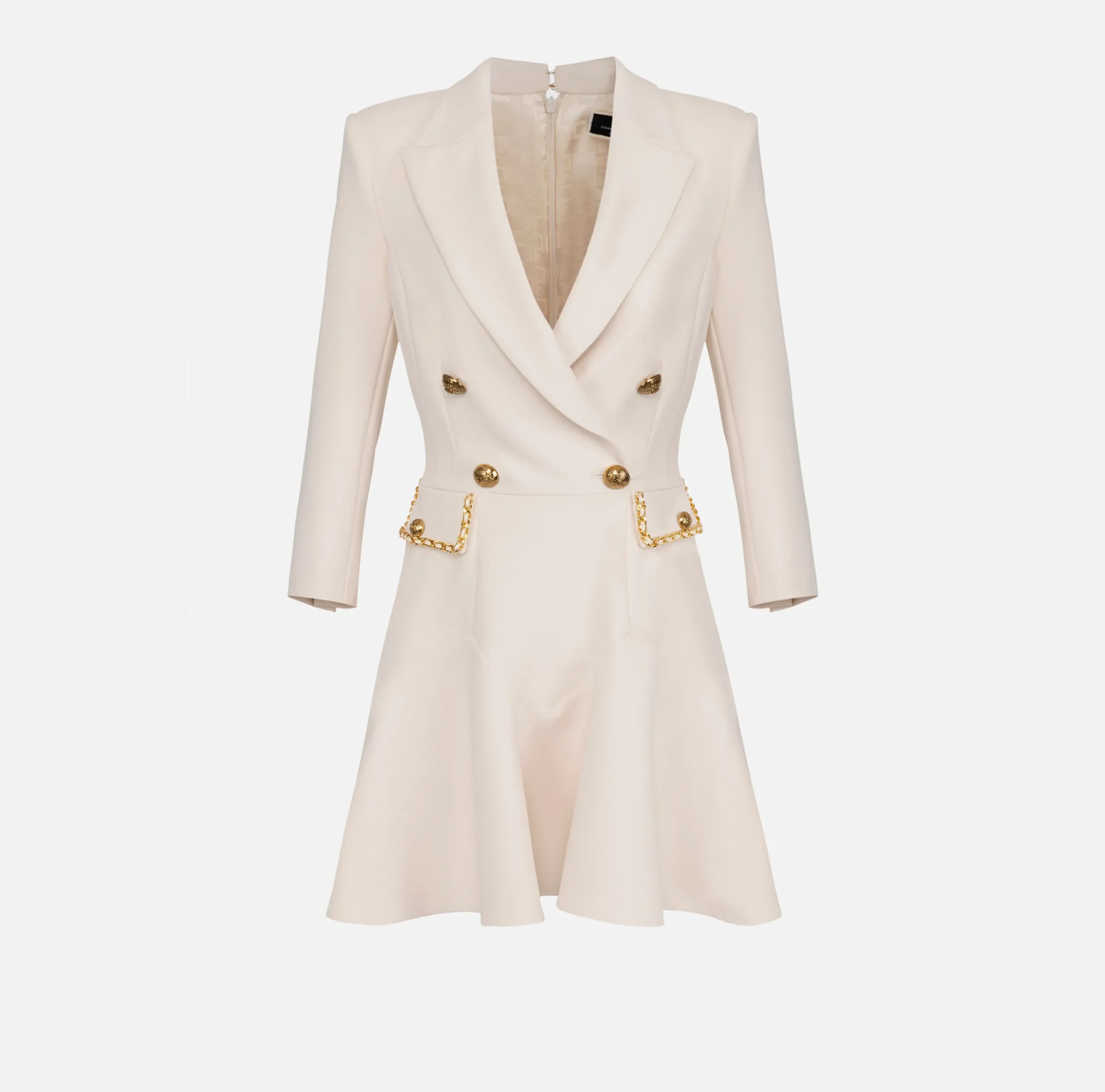Robe manteau doppiopetto in doppio crêpe stretch con revers a lancia e maniche a 3/4. Il punto vita è enfatizzato da patte profilate in catena infilata che sovrastano la gonna svasata al fondo.
