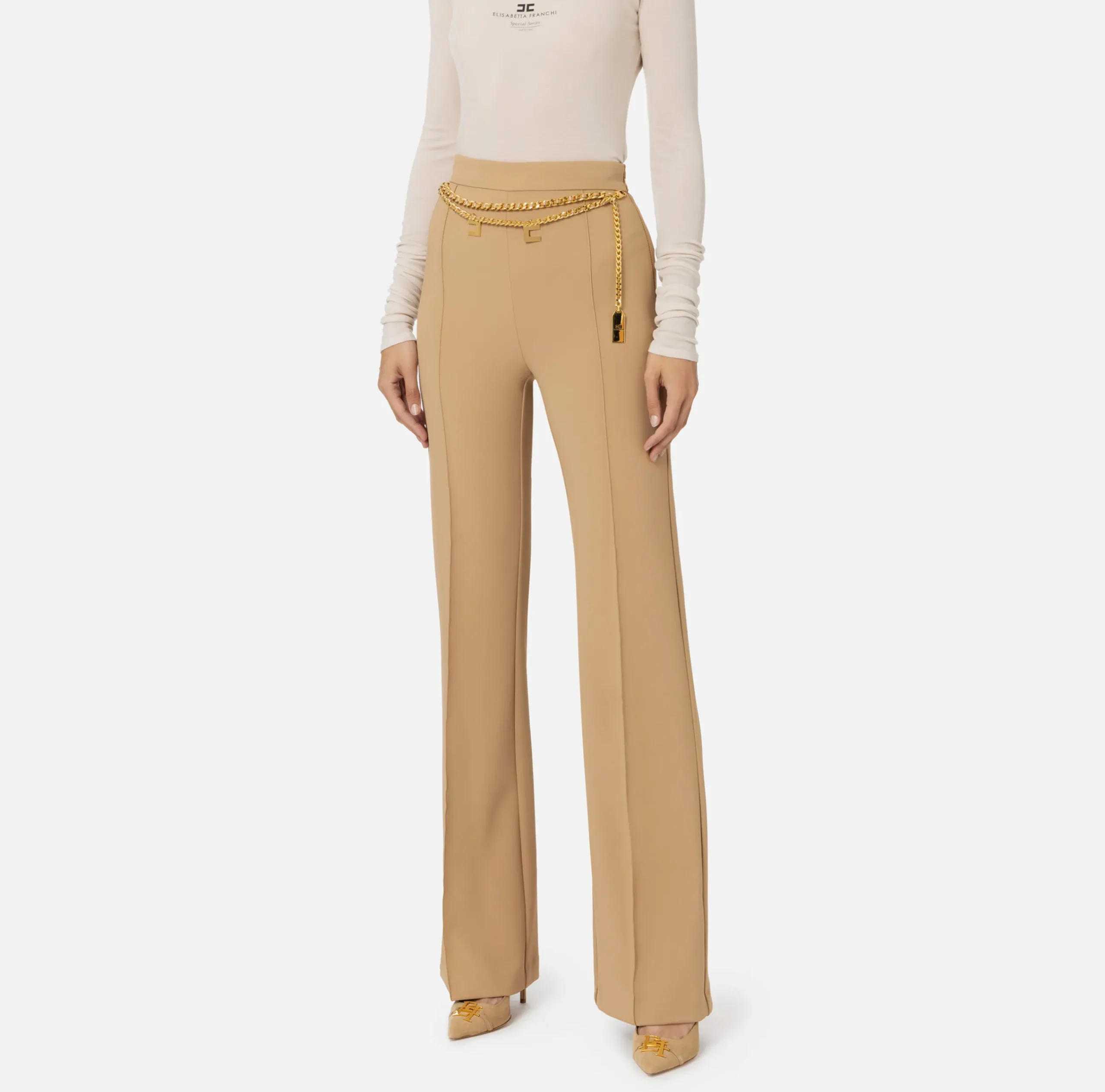 Pantalone a palazzo in doppio crêpe stretch. Il punto vita è enfatizzato da una cintura in catena infilata e charms logo in metallo dorato.