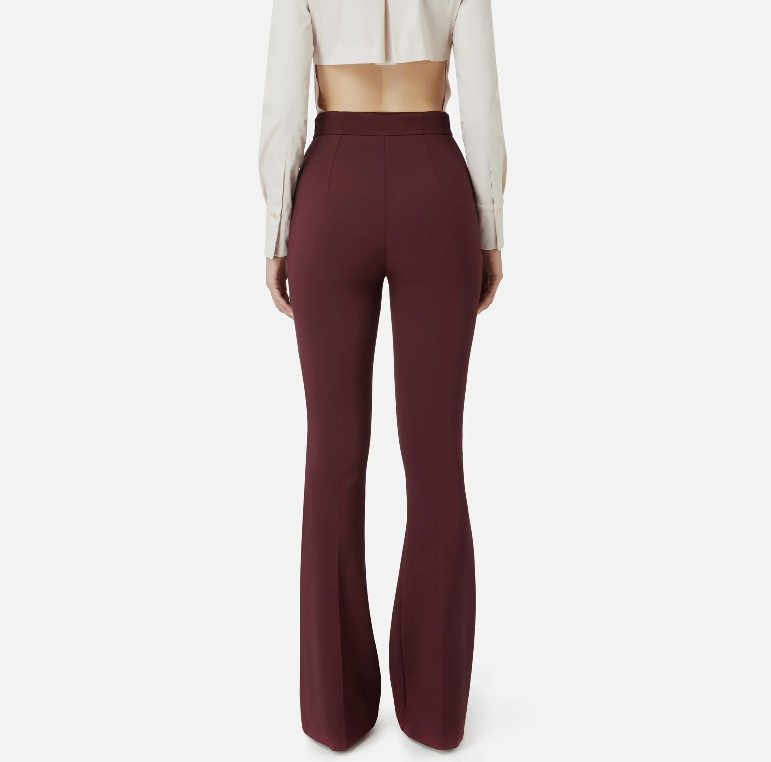Pantalone a zampa vita alta in crêpe stretch con fascione in raso. È caratterizzato da bottoniera sul bacino.