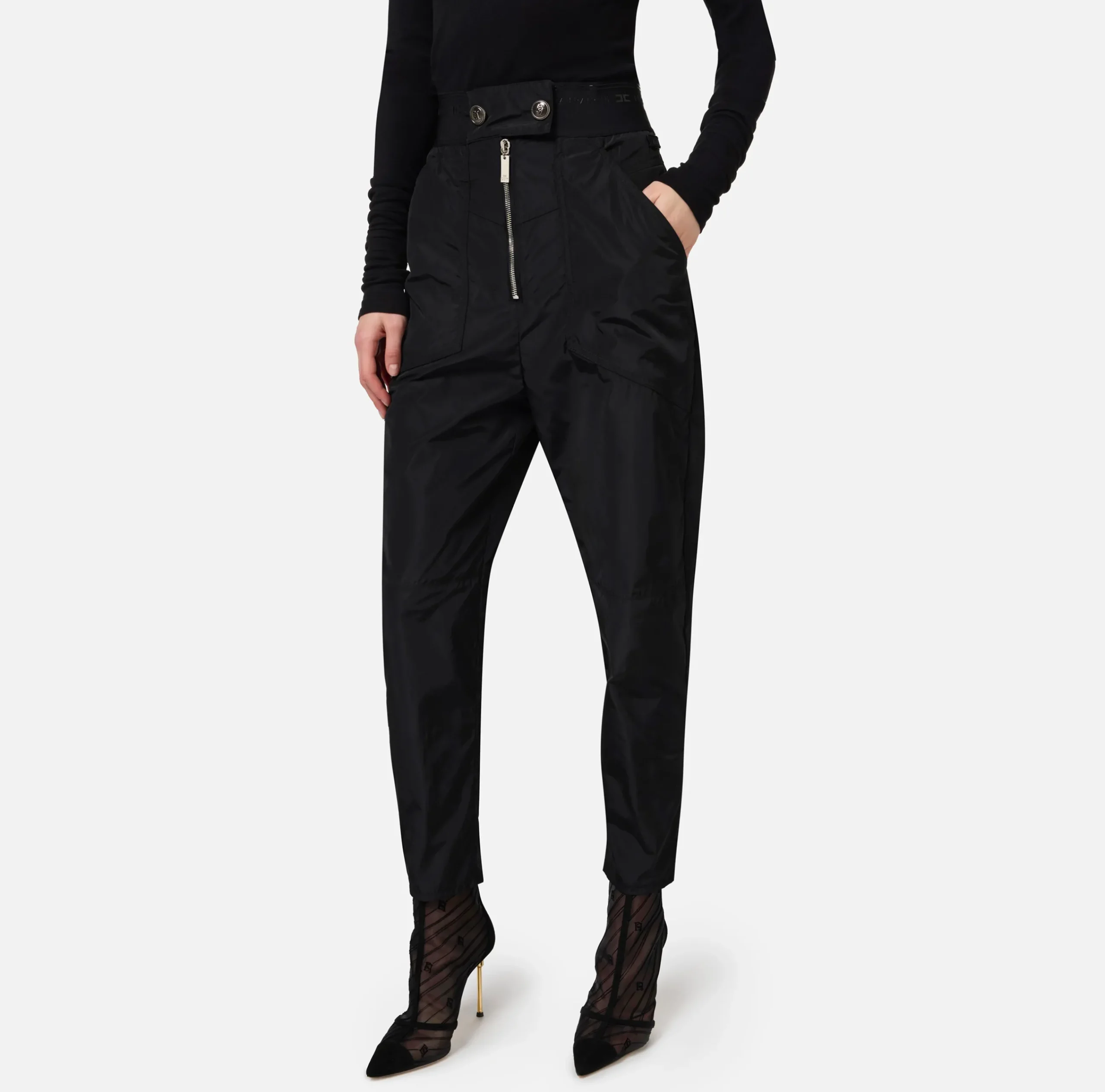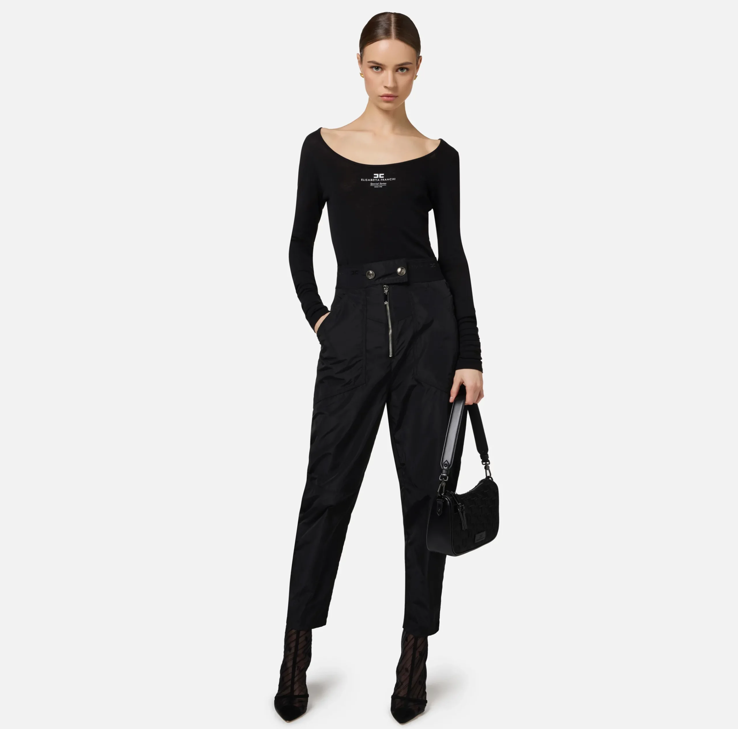 Pantaloni E Shorts|Elisabetta Franchi Pantalone boyfriend in nylon tecnico con elastico logato Nero