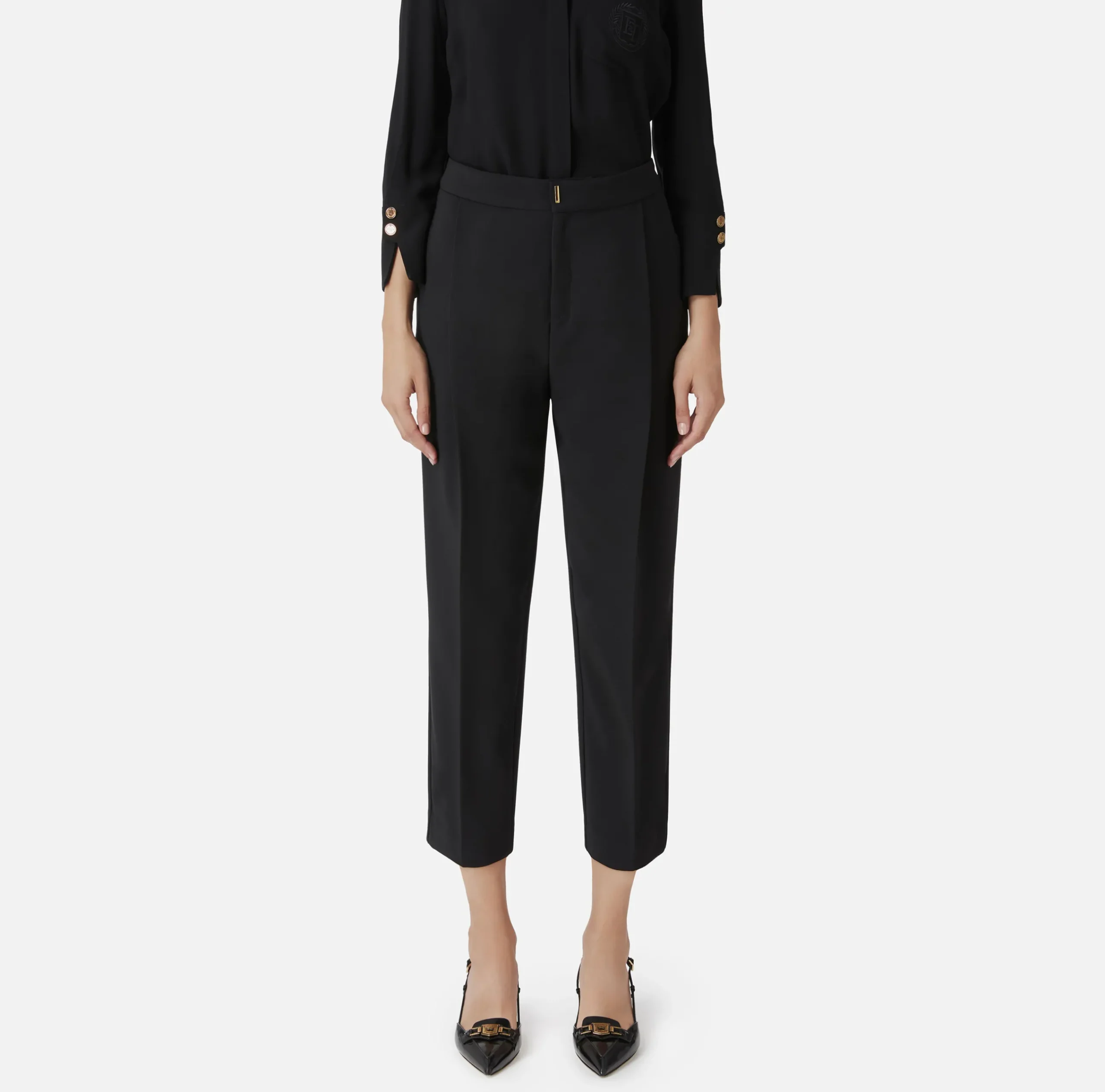 Pantalone dritto cropped in crêpe con pinces e stiro piega sul davanti. Il punto vita è enfatizzato da un fascione con placca verticale in metallo dorato.