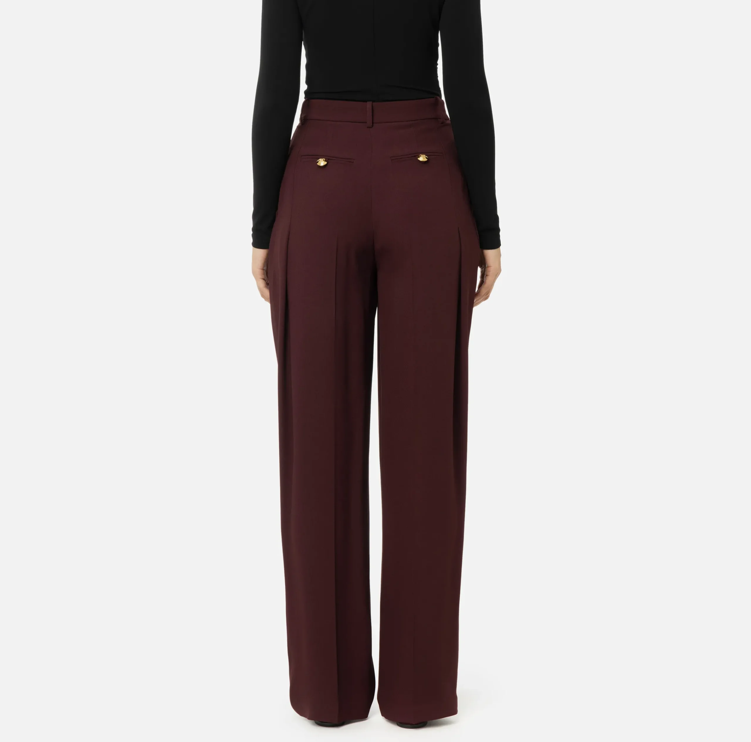 Pantalone dritto in enver satin opaco a vita alta con doppie pinces, tasche alla francese sul davanti e tasche a filetto rifinite da bottoni in metallo dorato sul retro.
