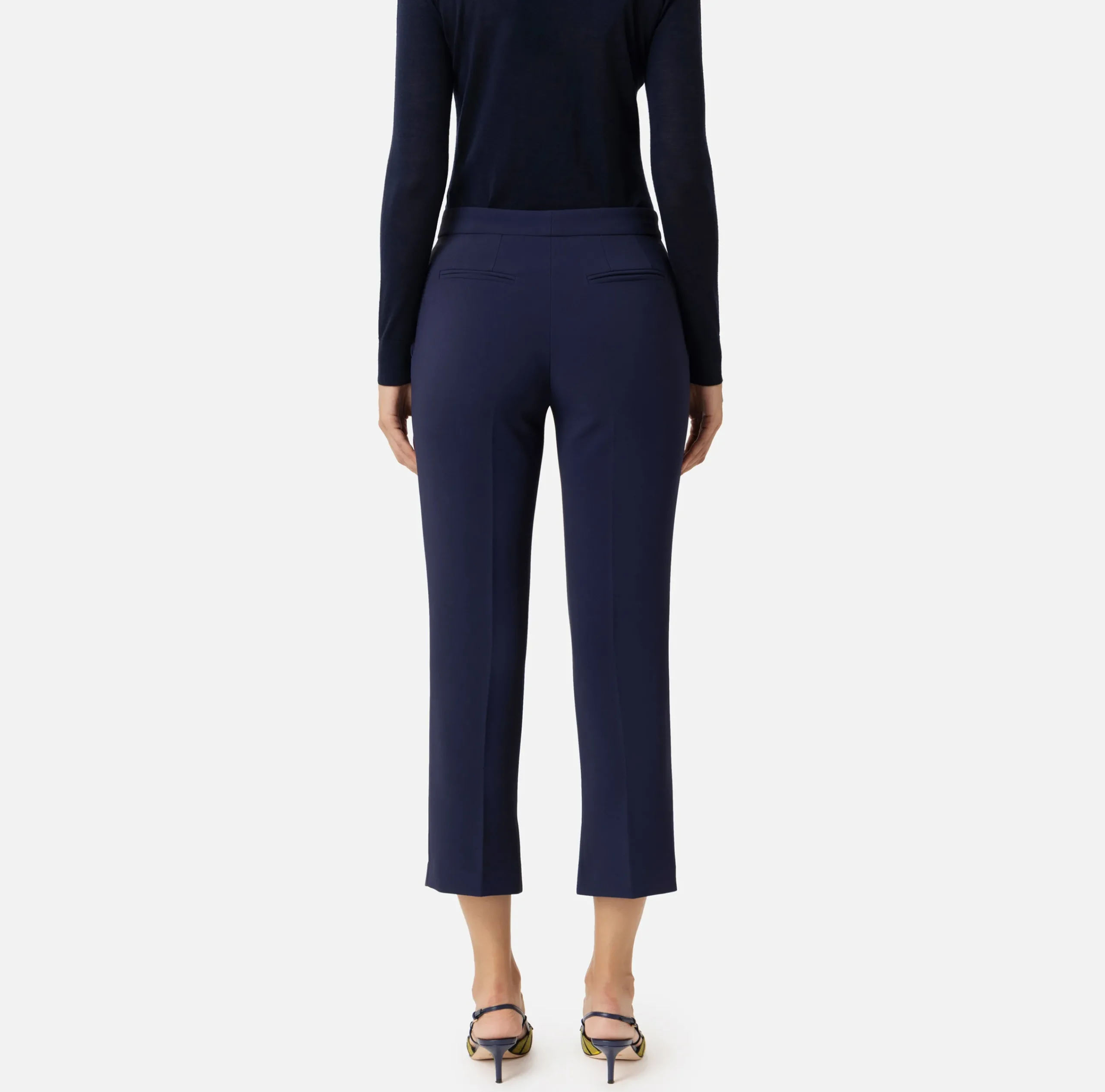 Pantalone dritto in crêpe leggero con stiro piega sul davanti espacchetti al fondo. Il punto vita è enfatizzato da un fascione con placca logo in metallo dorato.