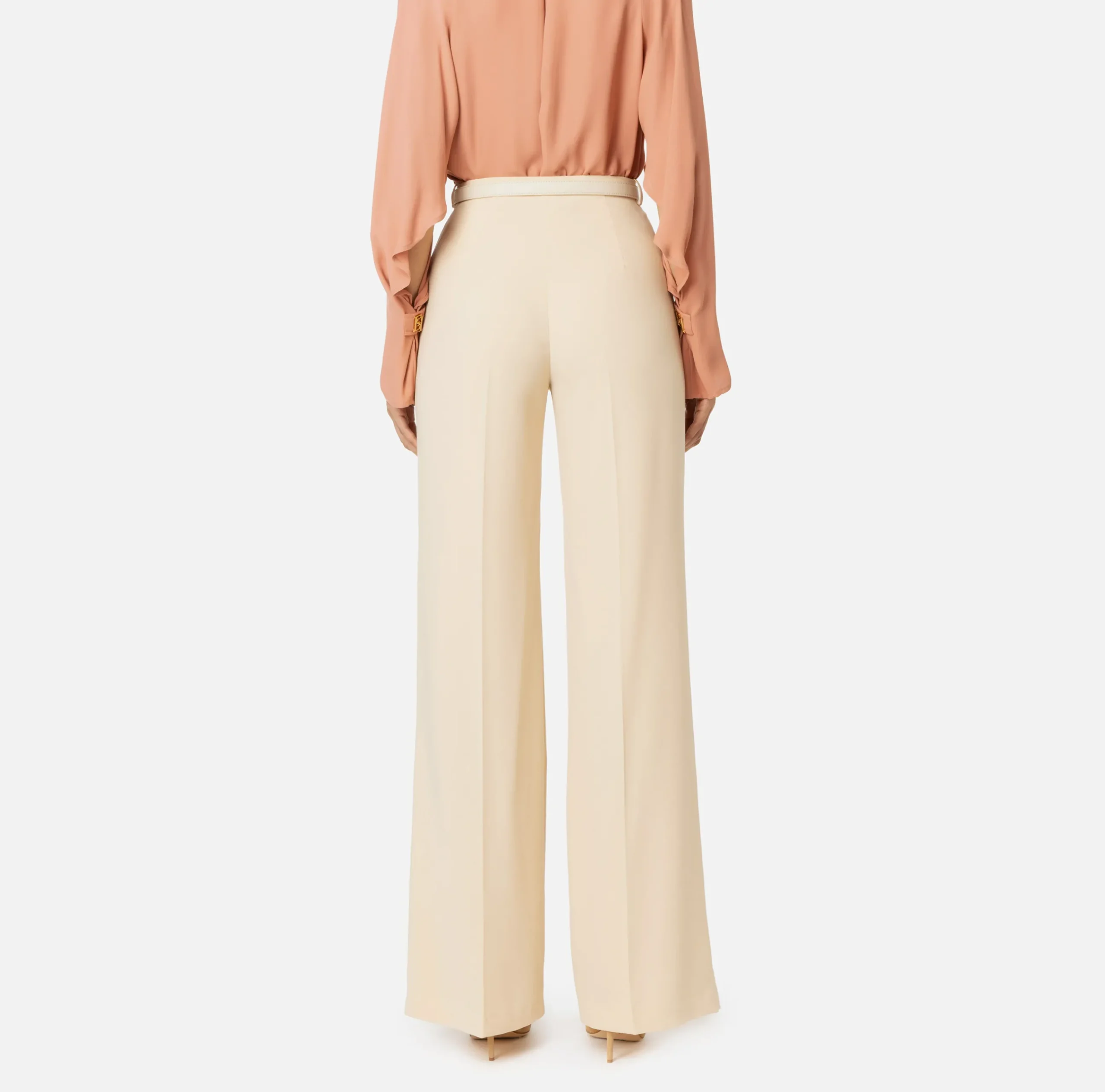 Pantalone palazzo in raso con stiro piega. Il punto vita è enfatizzato da una cintura con fibbia logo in metallo dorato e chiusura a pomelli.
